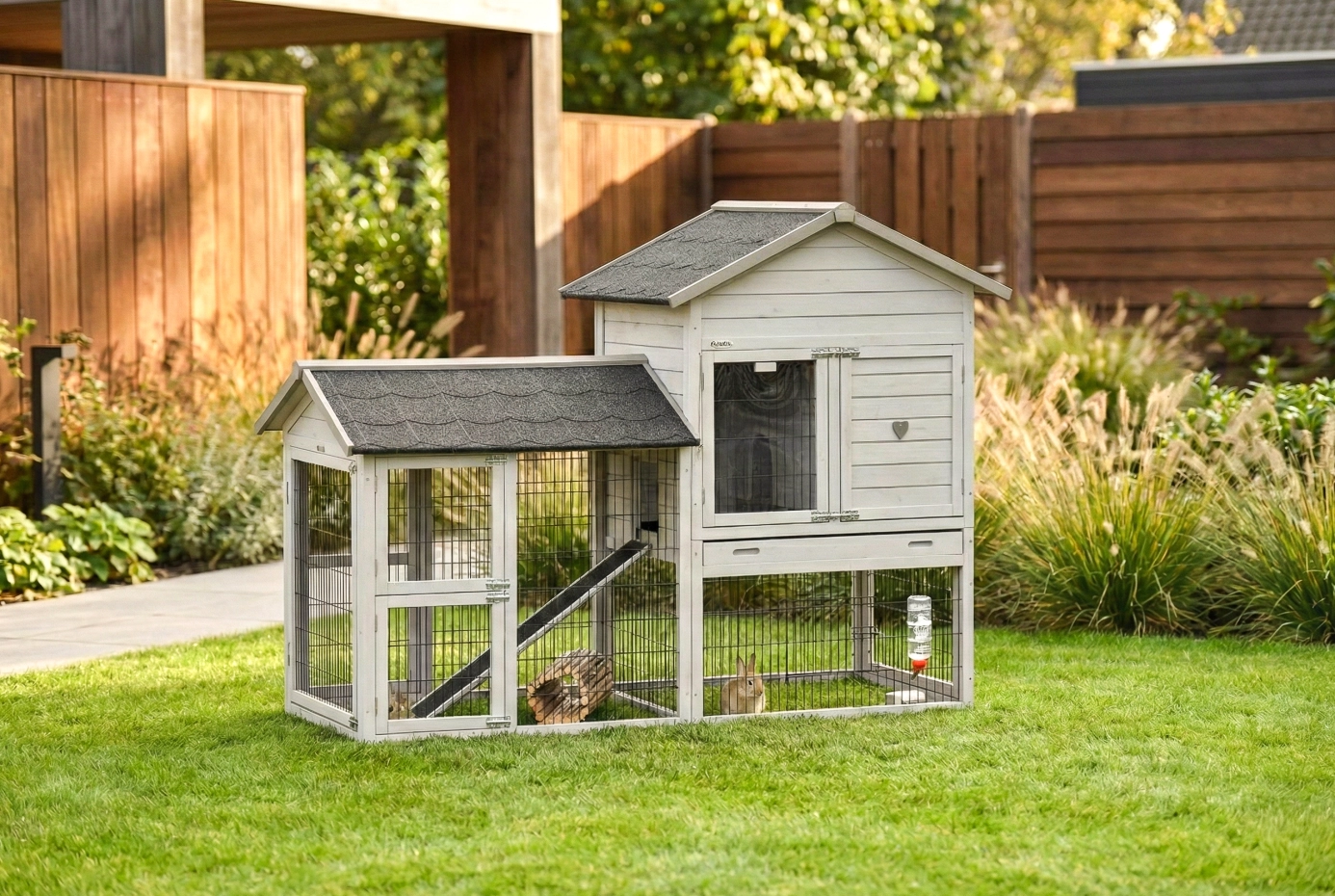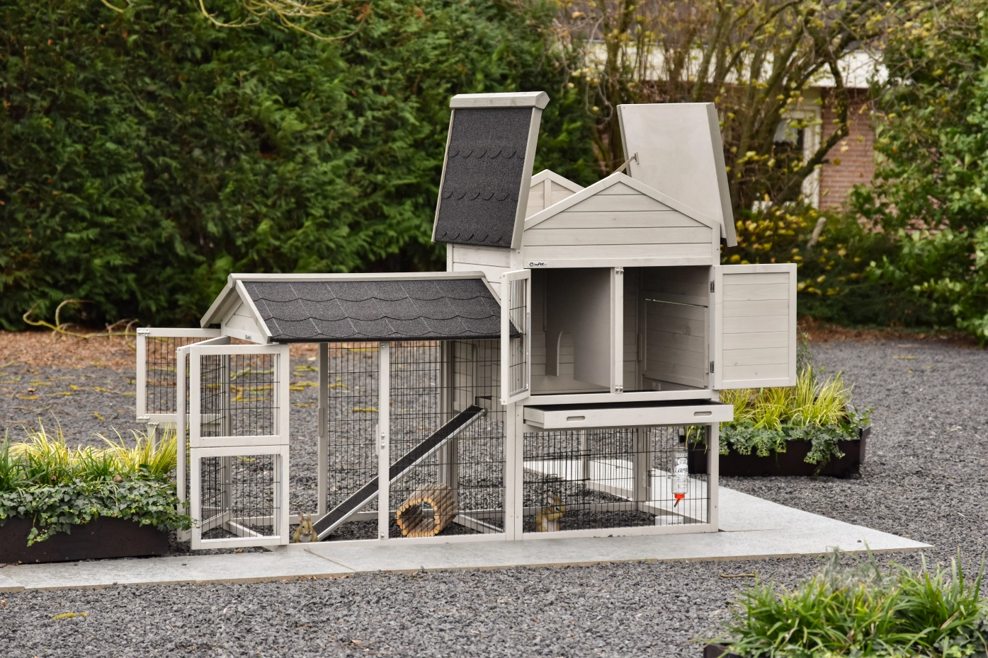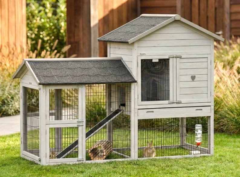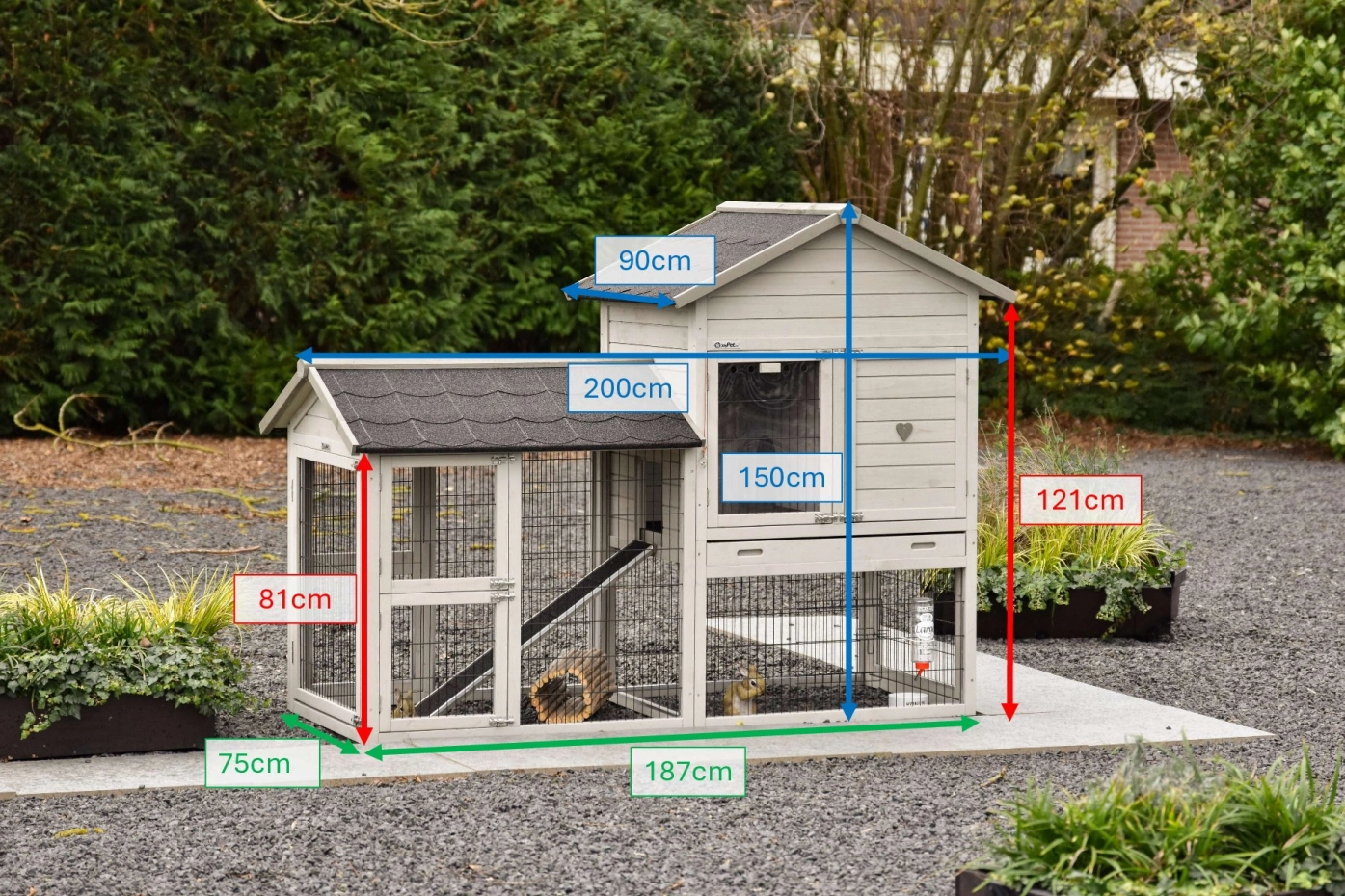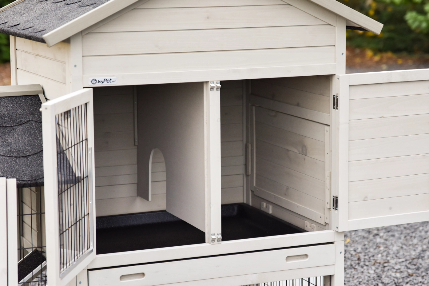 • Die Türen dieses Kaninchenstalls sind mit doppelten Schieberiegeln ausgestattet