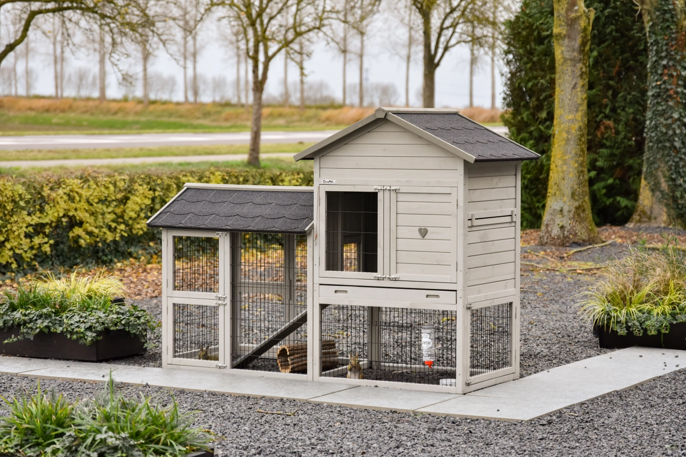Der Kaninchenstall Prestige Medium light-grey ist ein schöne Stall mit Nageschutzstreifen, große Türen und gummi Füßen. Diese große Stall hat verschiedene Türen, ein großes Schlafraum und große Auslauf. Die Abmessungen, inklusives Dach, sein 200x90x150cm. Mit ein kleine Anpassung können Sie diese Stall auch spiegelverkehrt aufbauen.