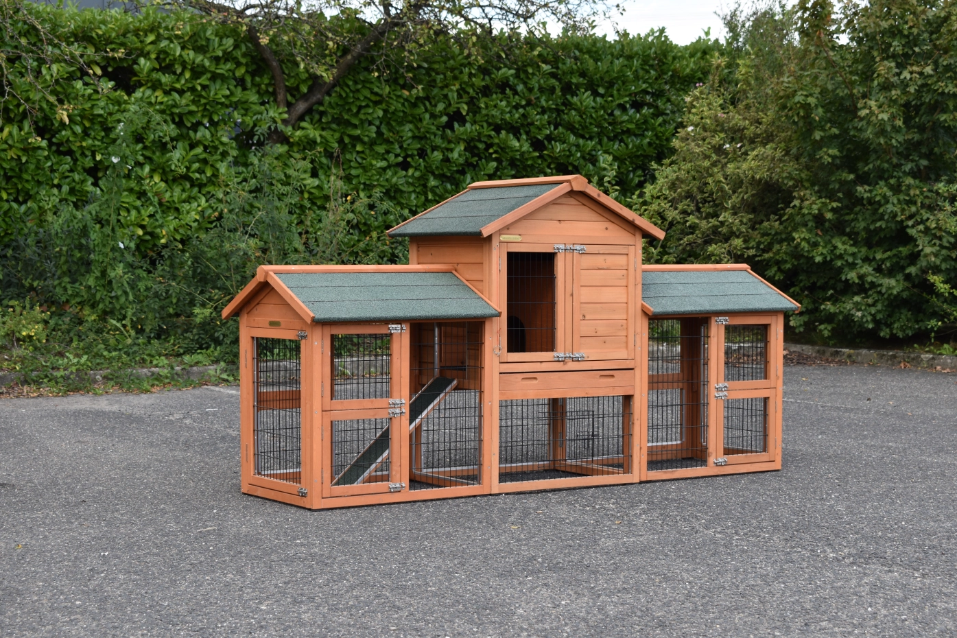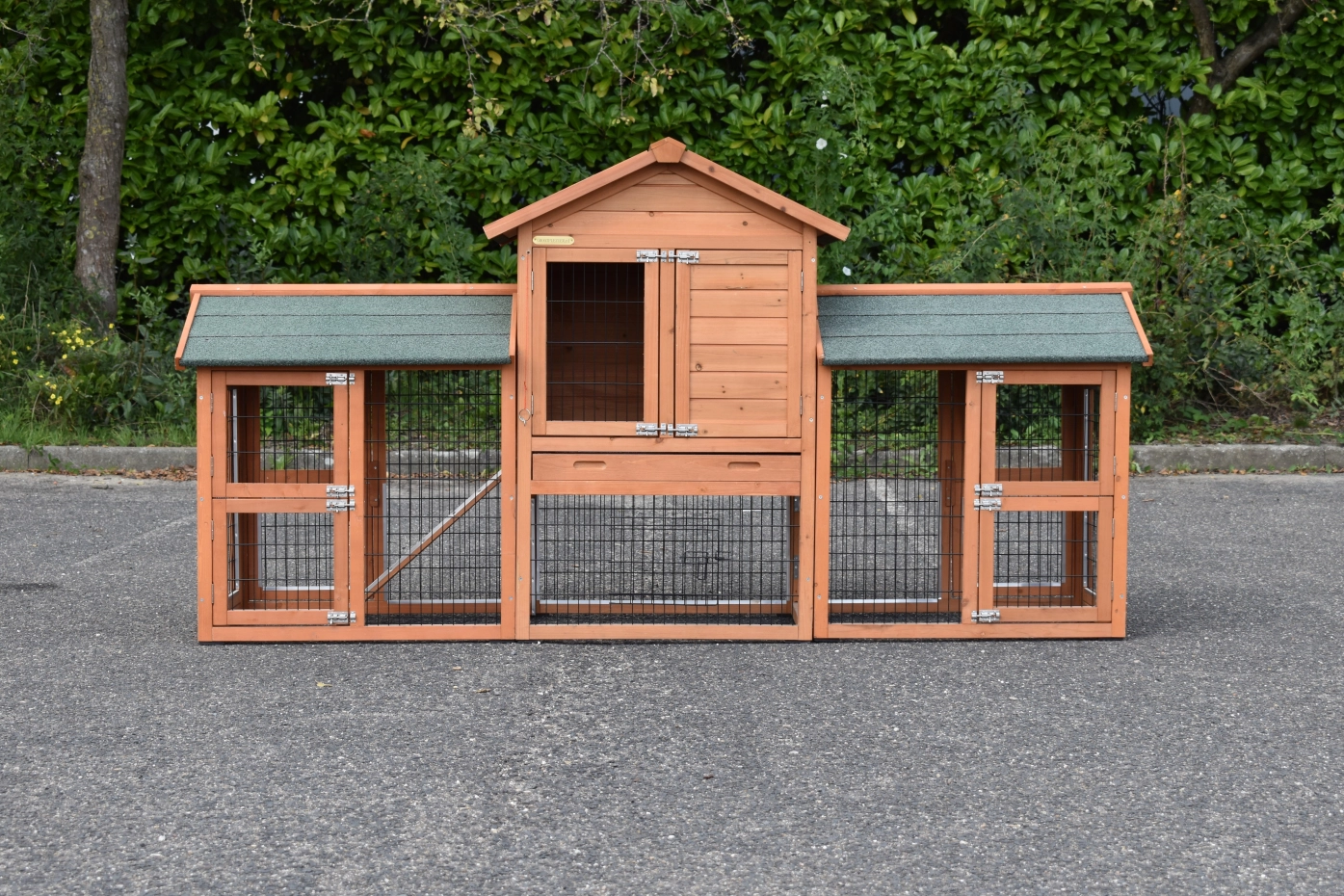 - Die Türen dieses Kaninchenstalls sind mit doppelten Schieberiegeln ausgestattet