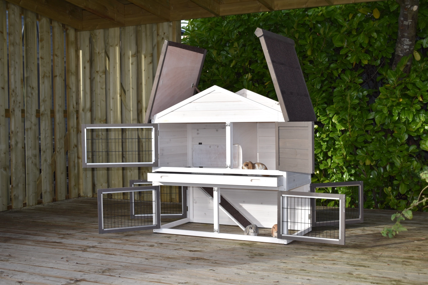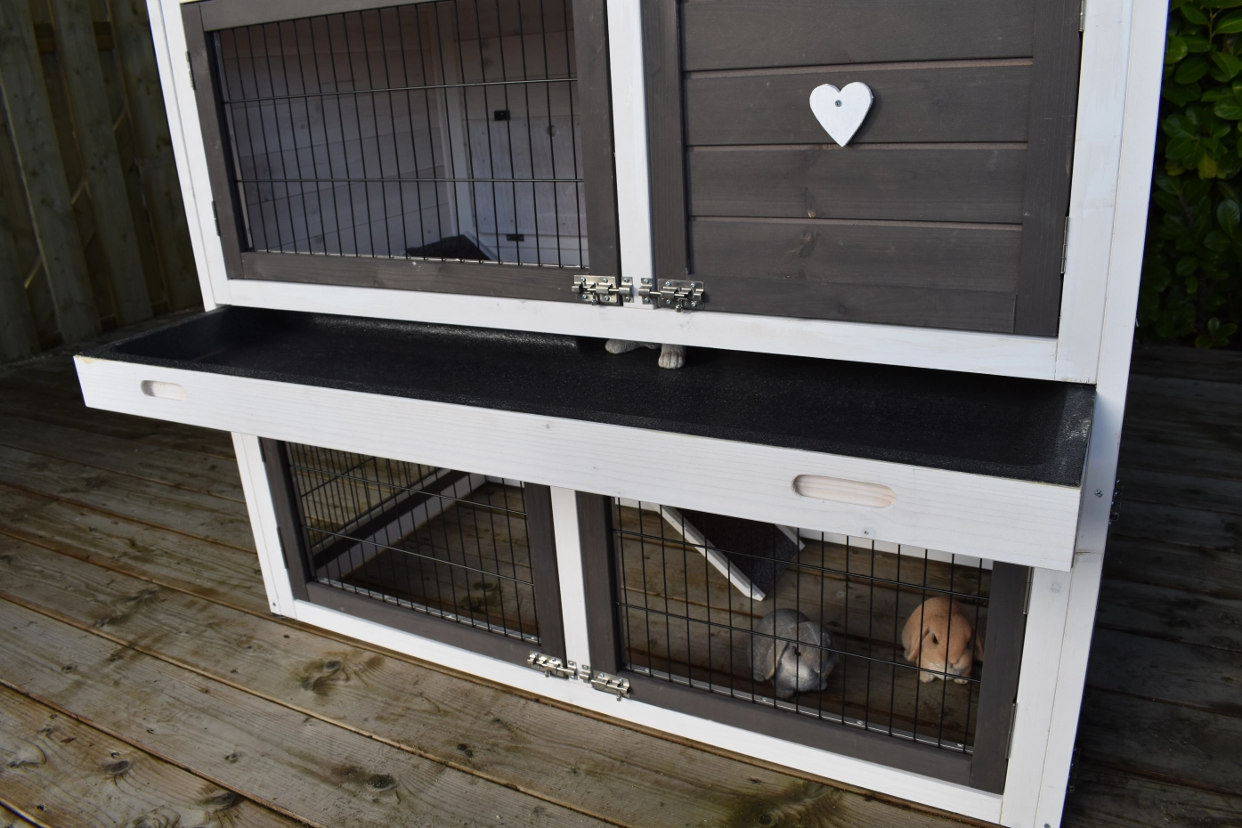 Kaninchenstall Regular Medium ist ein schöne Kaninchenstall. Diese Stall ist geignet für 2 mittelgroße oder 3 kleine Kaninchen. Durch der praktische Schublade ist der Stall leicht zu reinigen. Der Stall hat oben und unten große Türen. Das Dach ist ausgestattet mit Dachpappe, und ist auch ausgestattet mit ein Stauraum. Die Kaninchen können beide Etagen erreichen durch der Leiter. Der Unterauslauf kann einfach abgeschlossen werden. Der Stall aus Holz ist ausgestattet mit Nageschutzstreifen. Der Stall hat gummi Füße.