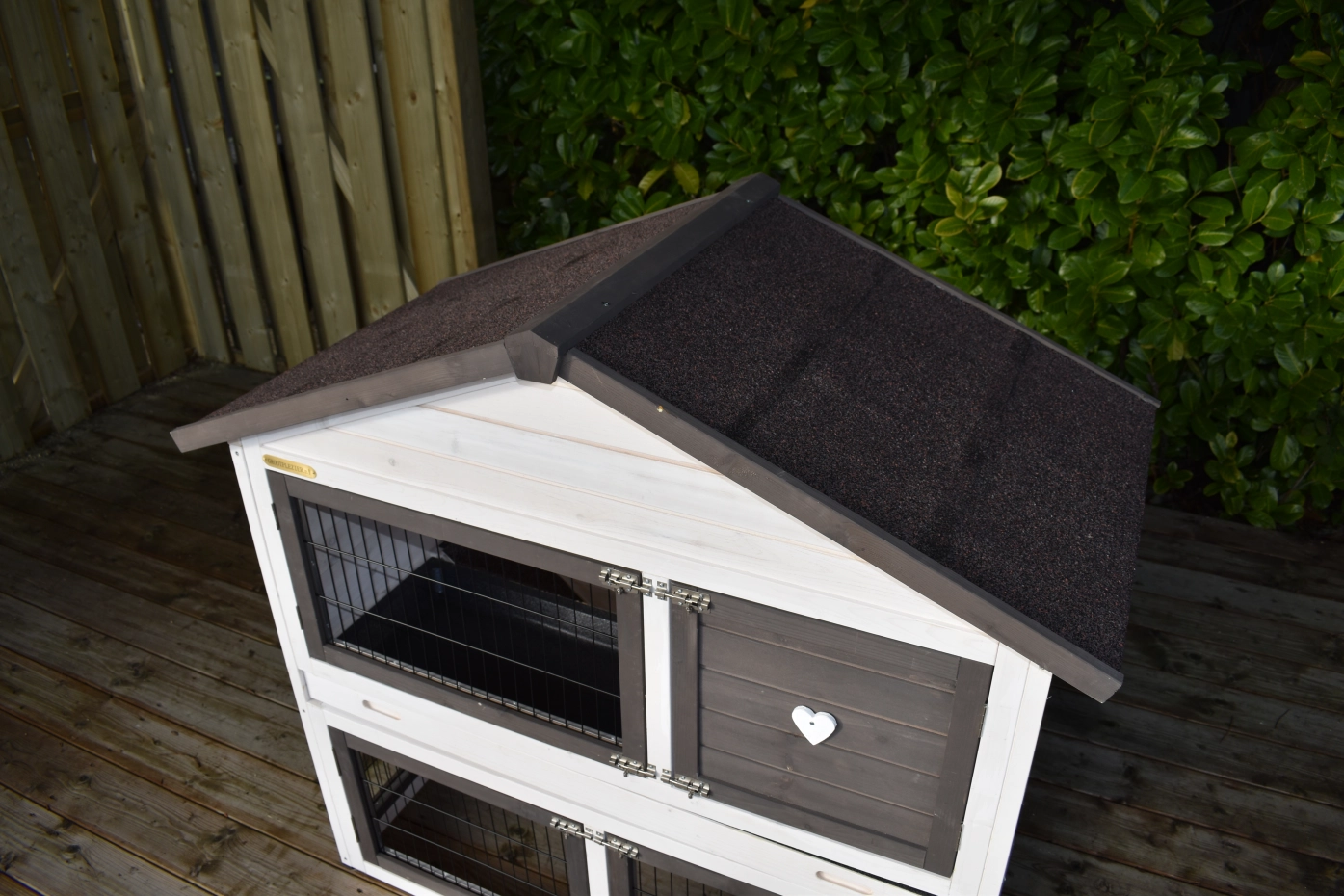 • Das Dach dieses Kaninchenstalls ist mit Dachpappe versehen.