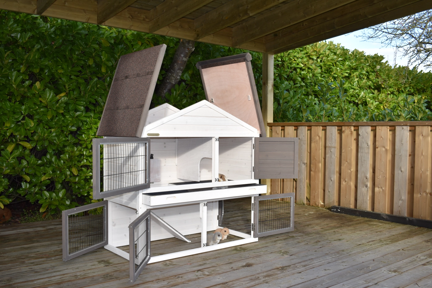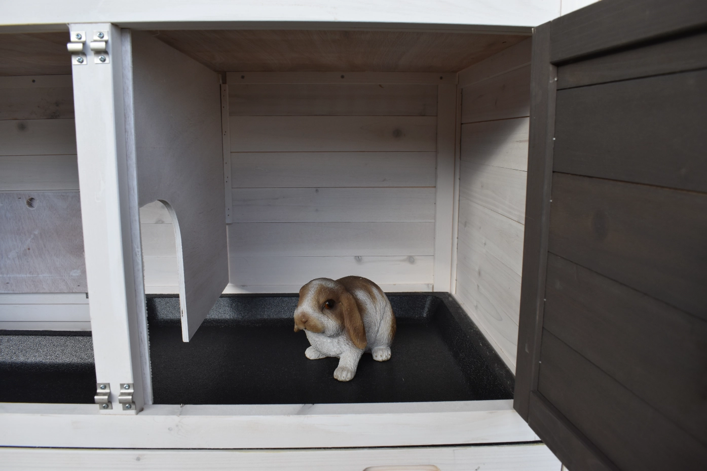 • Die Türen dieses Kaninchenstalls sind mit doppelten Schieberiegeln ausgestattet