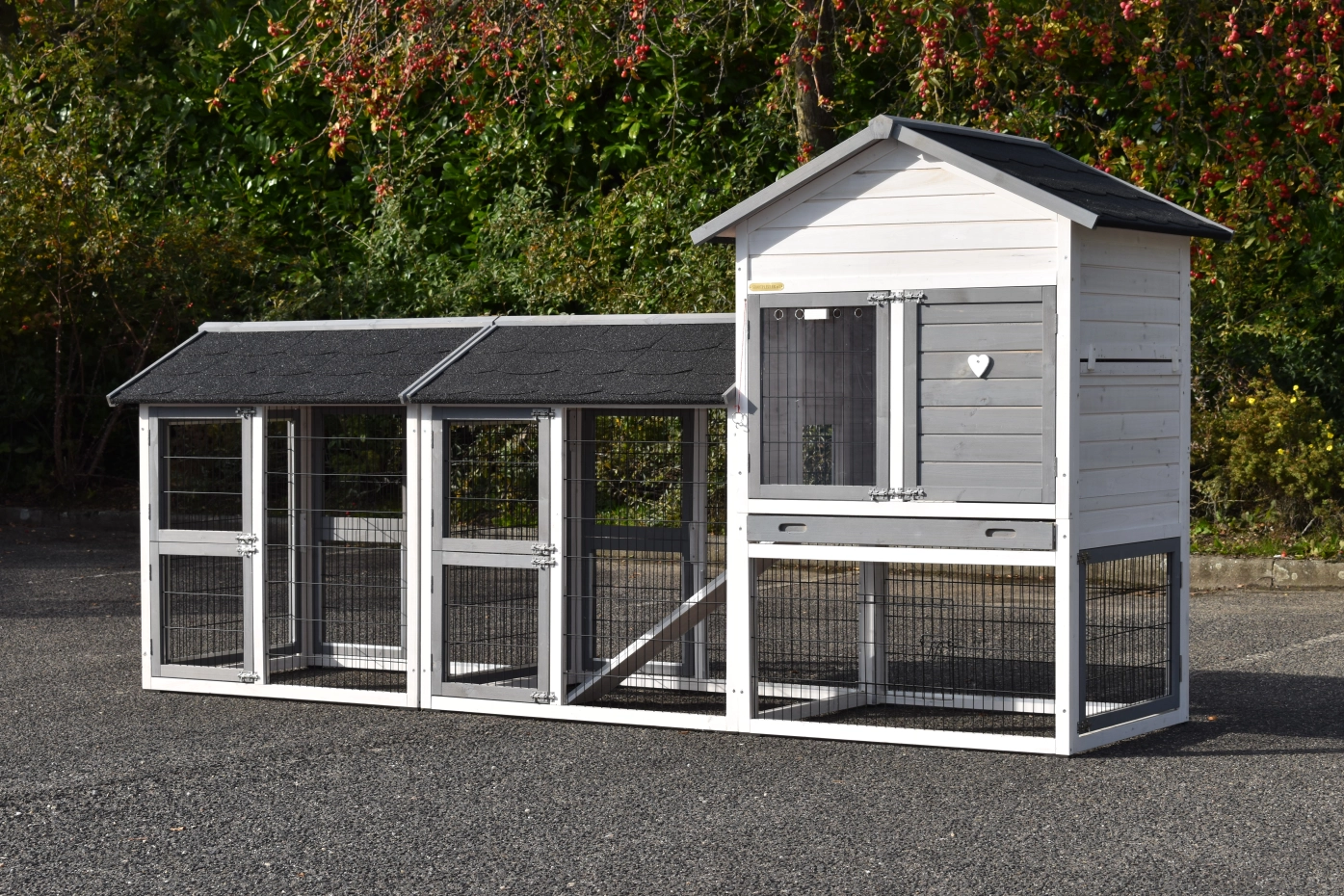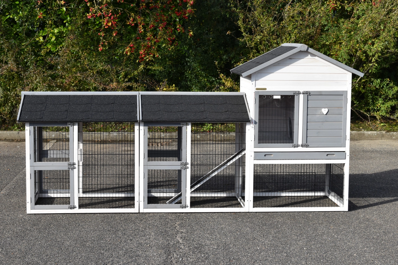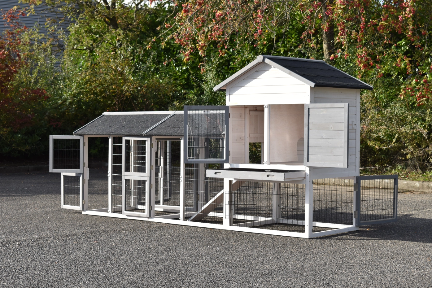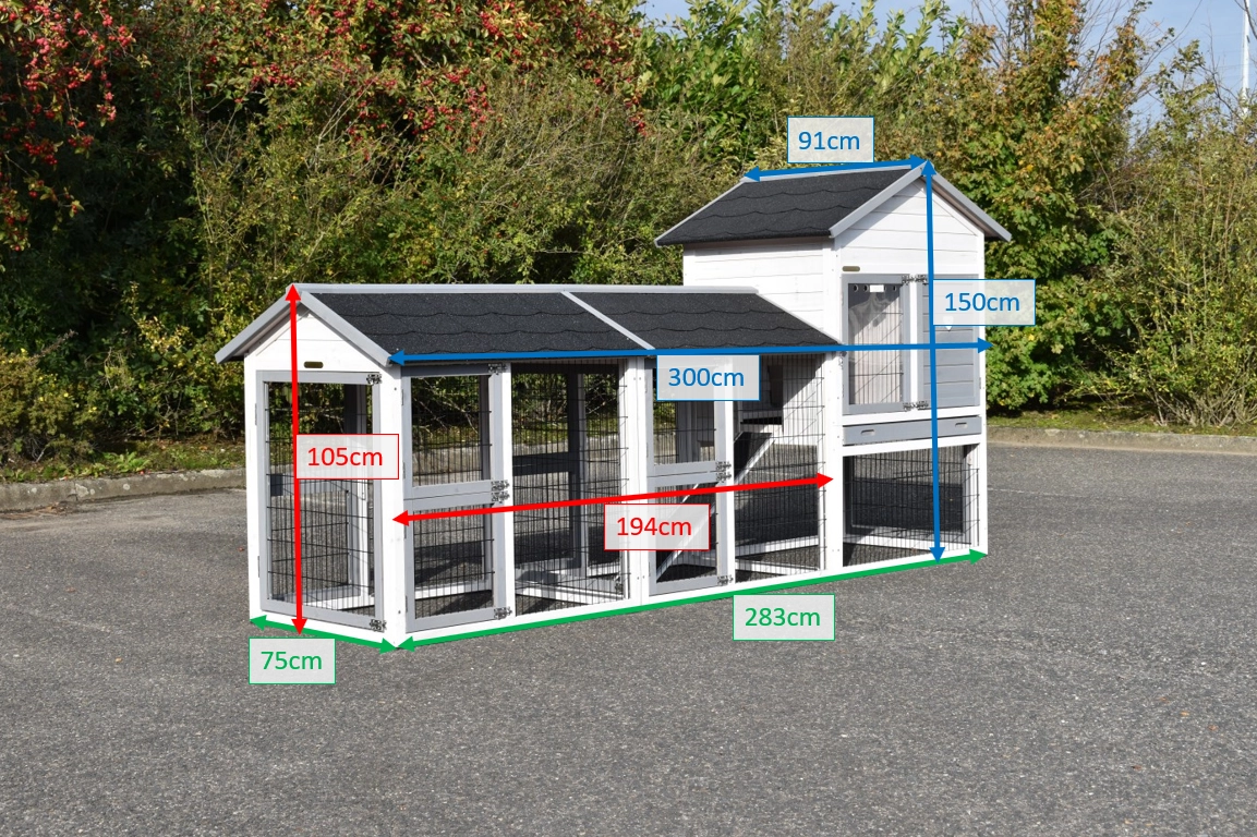 Kaninchenstall Prestige Medium ist ein schöne Stall mit Nageschutzstreifen, große Türen und gummi Füßen. Diese Stall hat ein groß Schlafraum und ein große Auslauf. Die max. Abmessungen sind 300x91x150cm. Diese Stall kann, mit ein kleine Anpassung, spiegelverkehrt aufgebaut werden.