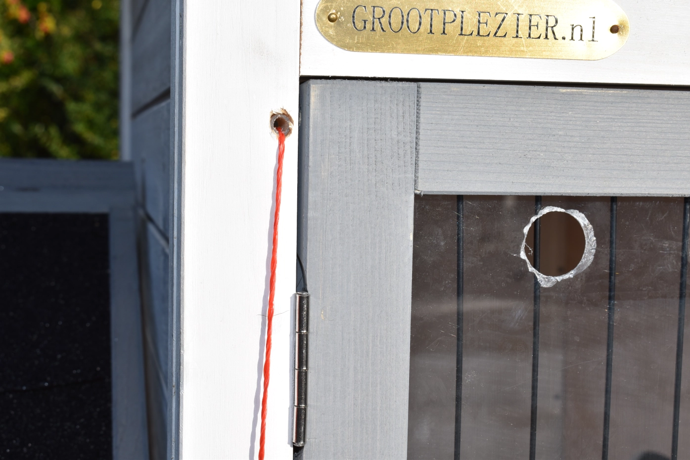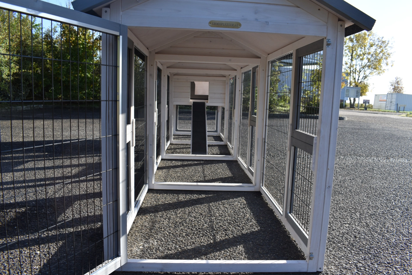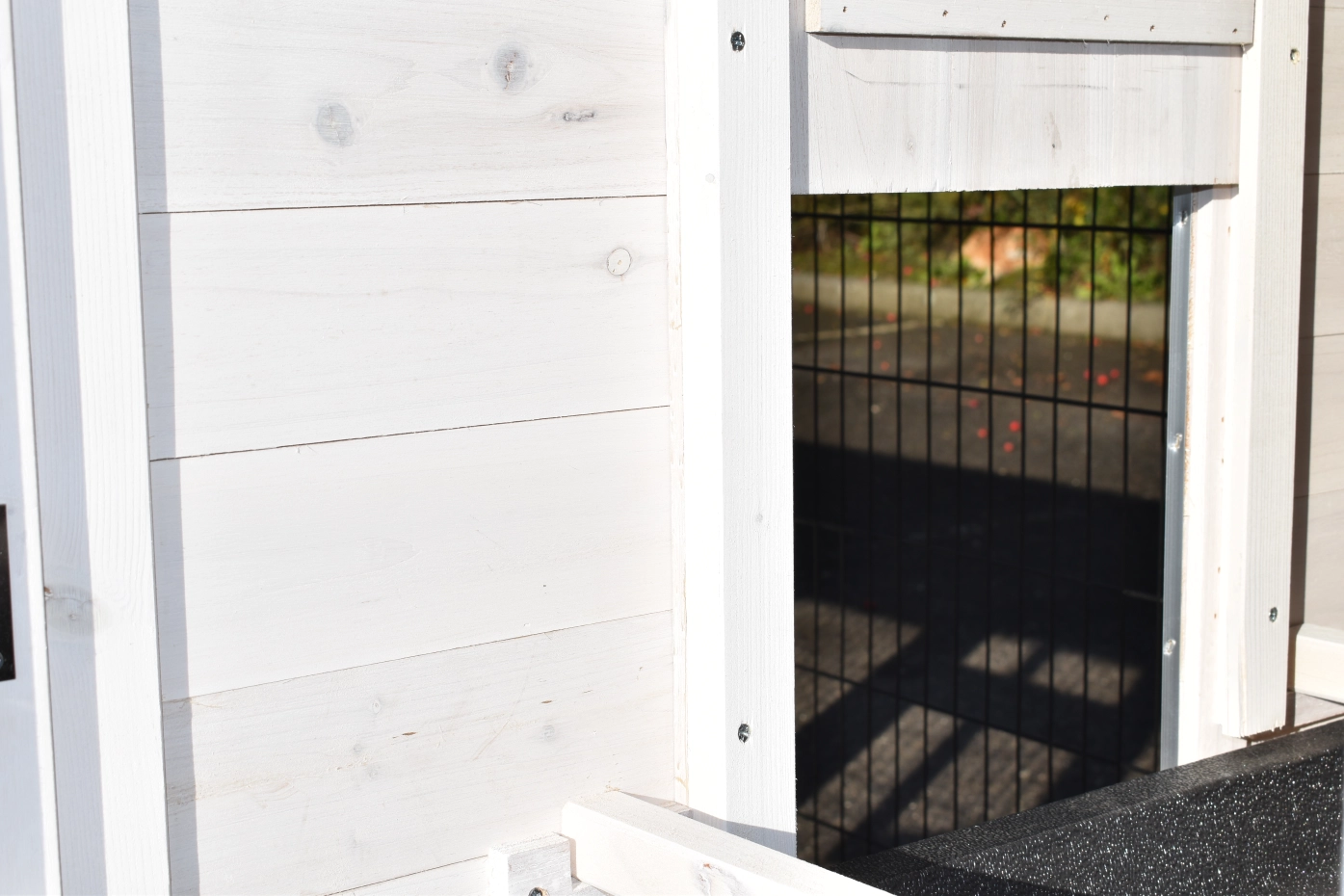 - Um diesen Stall mit einem Auslauf zu kombinieren, muss eine Tür oder ein Gitterteil entfernt werden.
