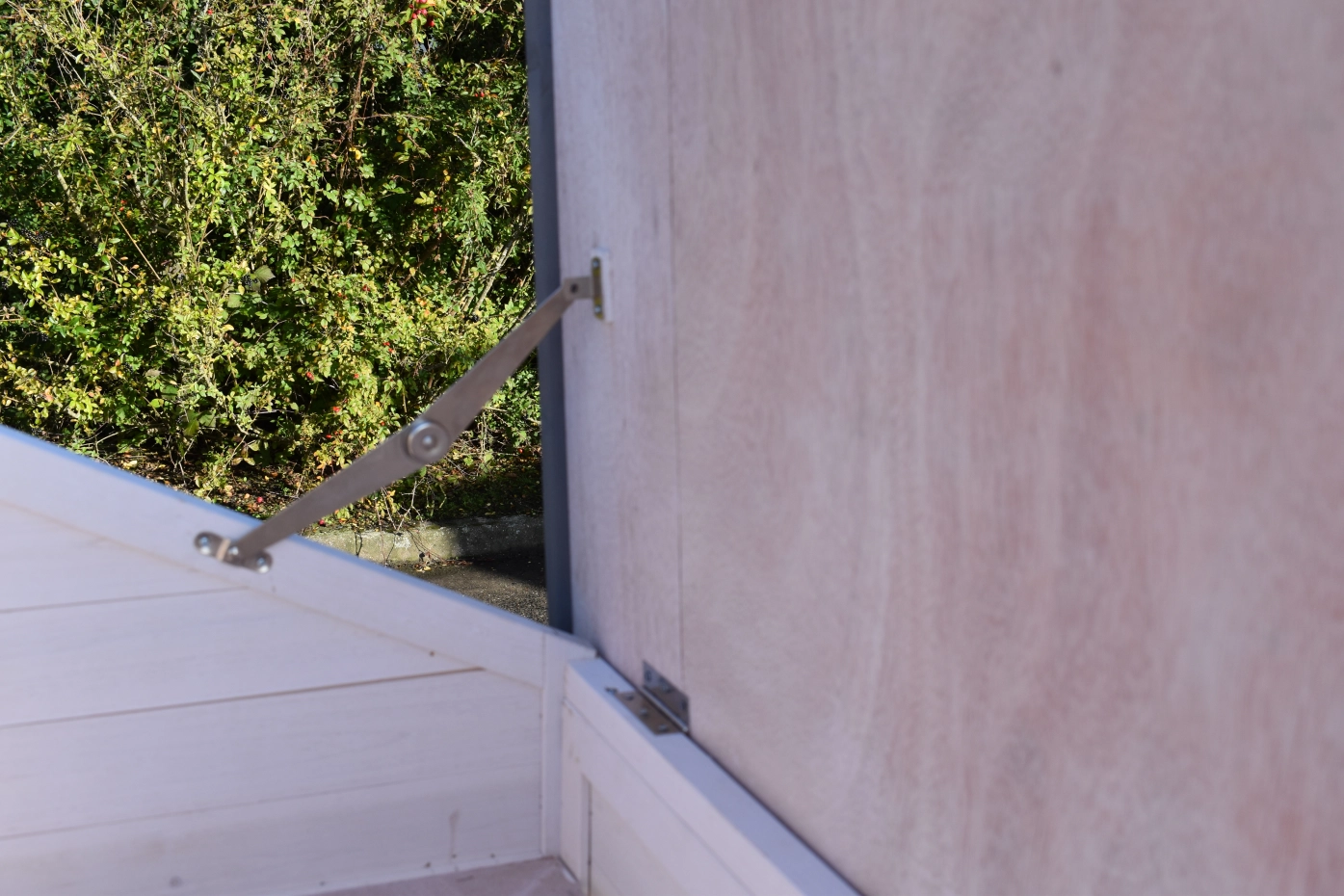 Zur Vermeidung von Rost- und Korrosionsbildung empfiehlt es sich, Schlösser und Beschläge regelmäßig mit Silikonspray oder Schlösserspray zu behandeln. Steht die Tierunterkunft nicht an einem geschützten Ort, empfehlen wir Ihnen, die Tierunterkunft zu verankern.