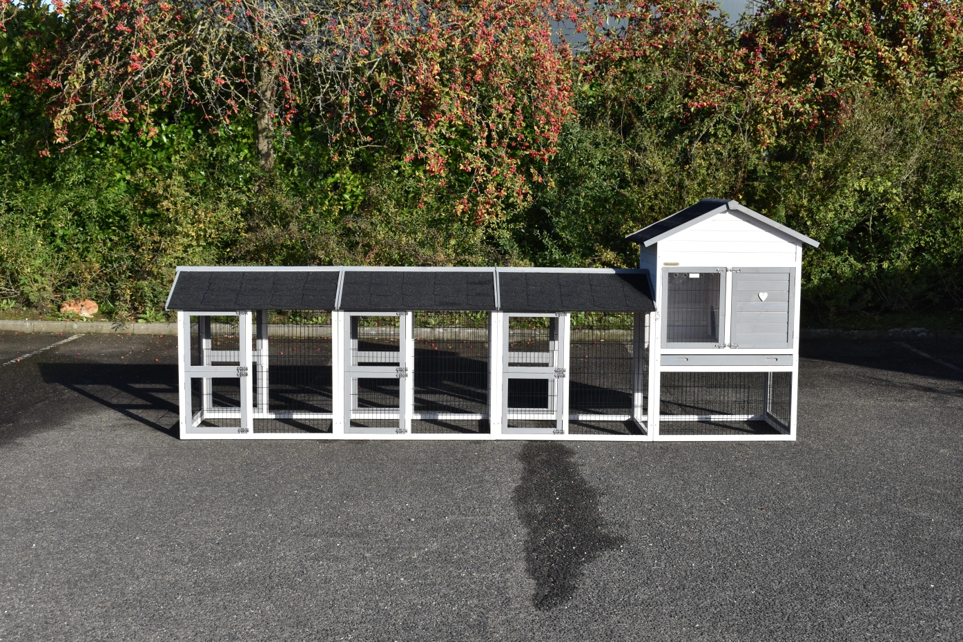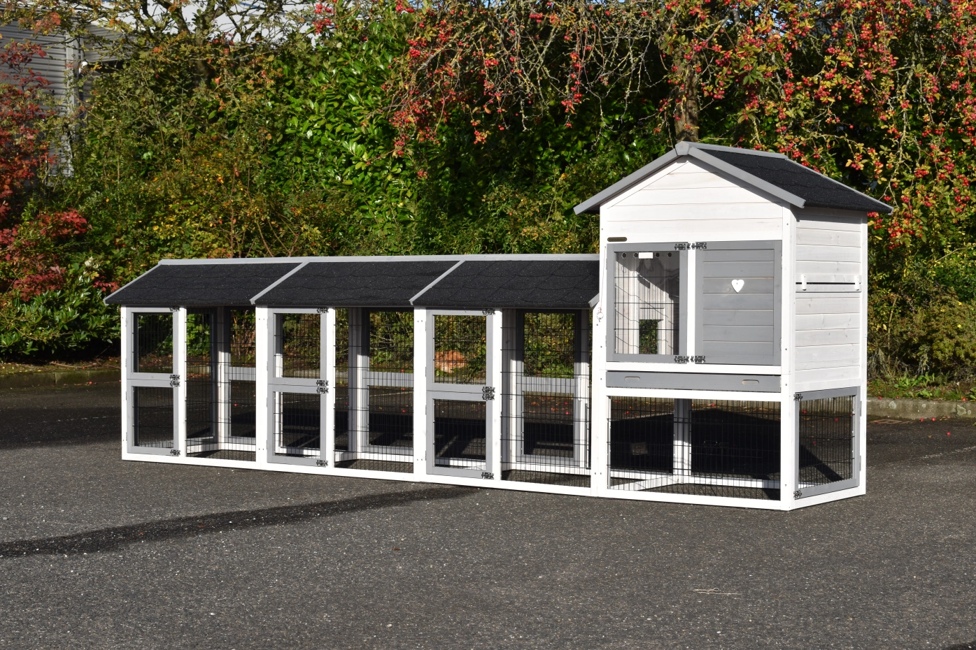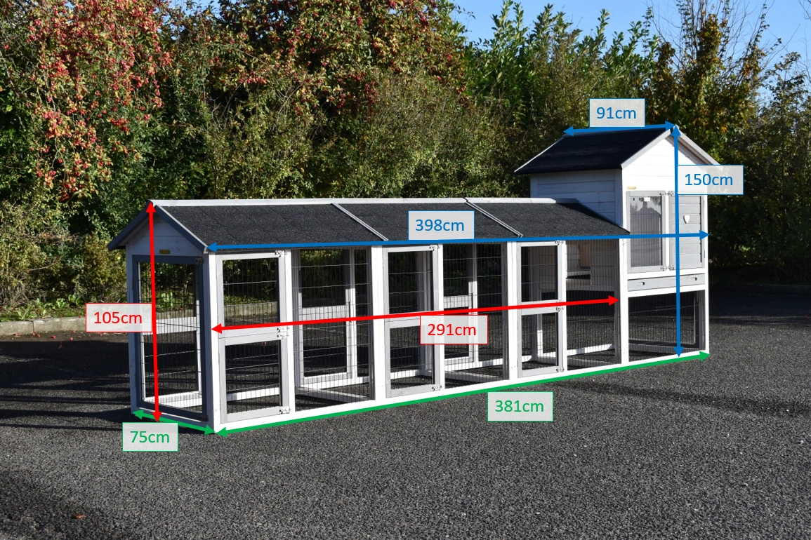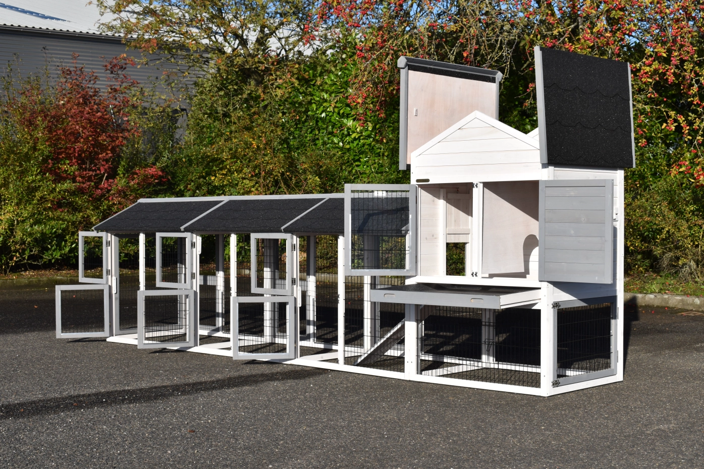 Kaninchenstall Prestige Medium ist ein schöne Stall mit Nageschutzstreifen, große Türen und gummi Füßen. Diese Stall hat ein groß Schlafraum und ein große Auslauf. Die max. Abmessungen sind 398x90x150cm . Diese Stall kann, mit ein kleine Anpassung, spiegelverkehrt aufgebaut werden.