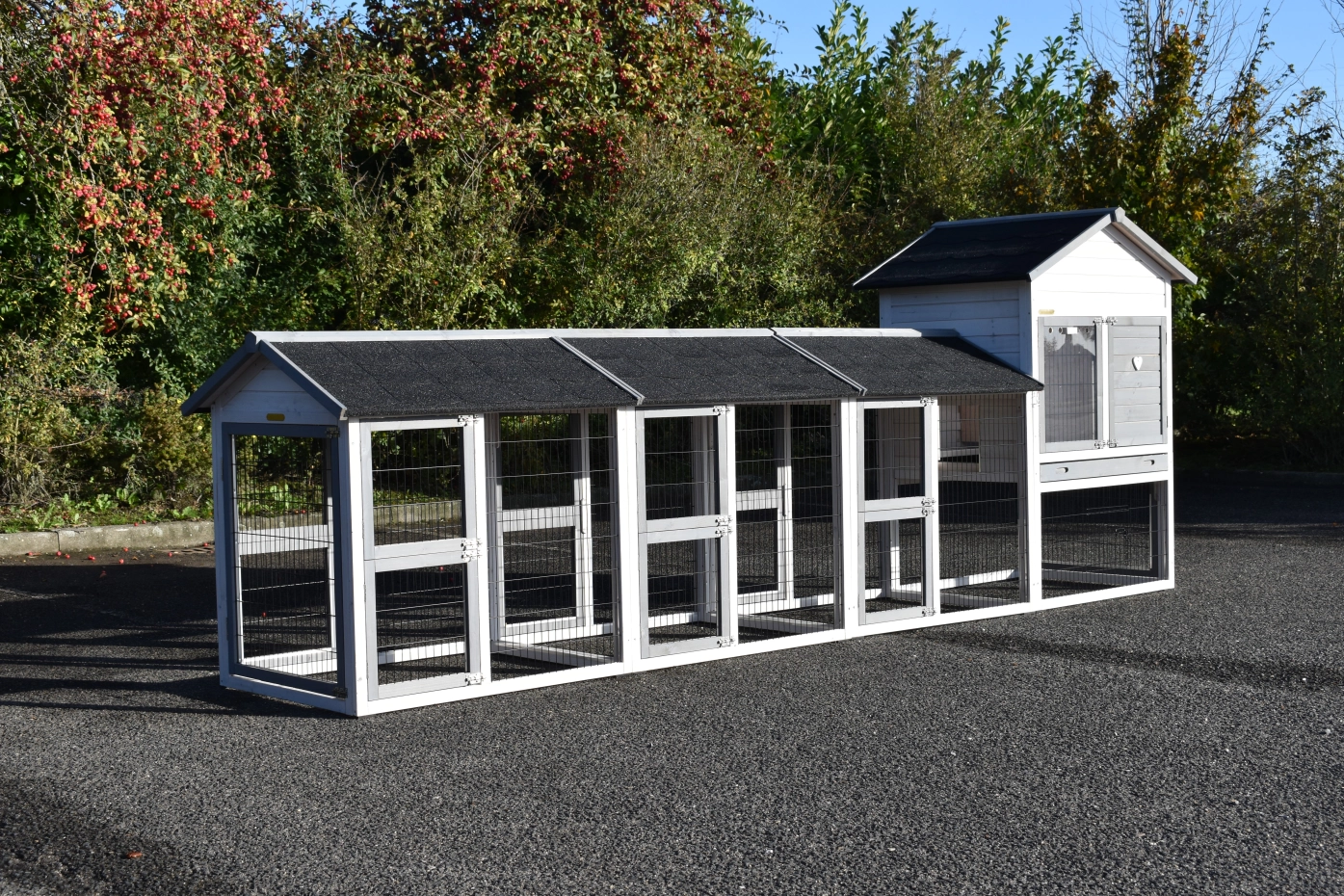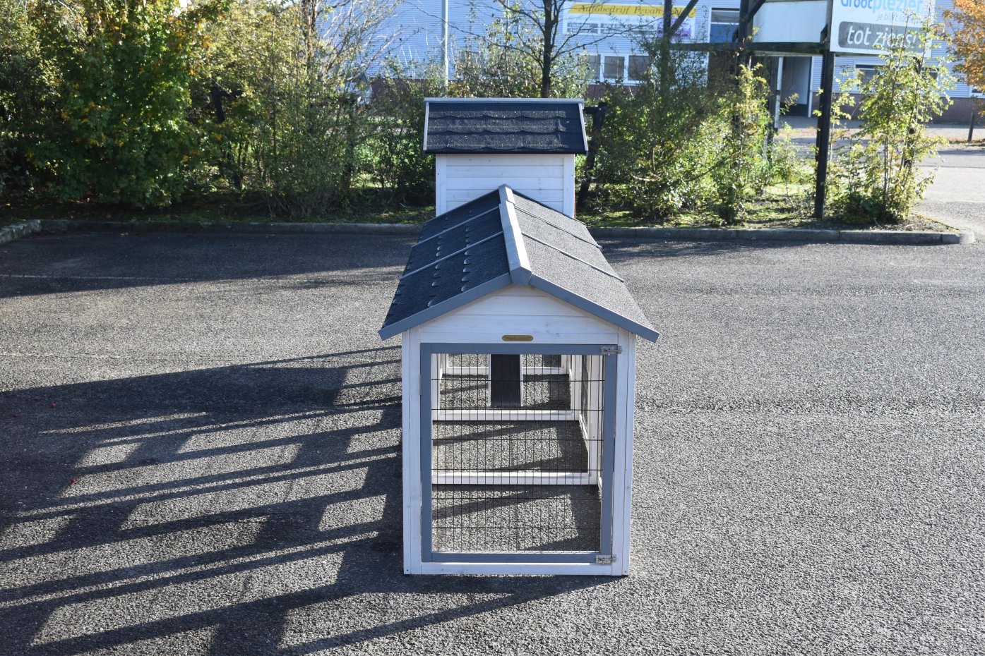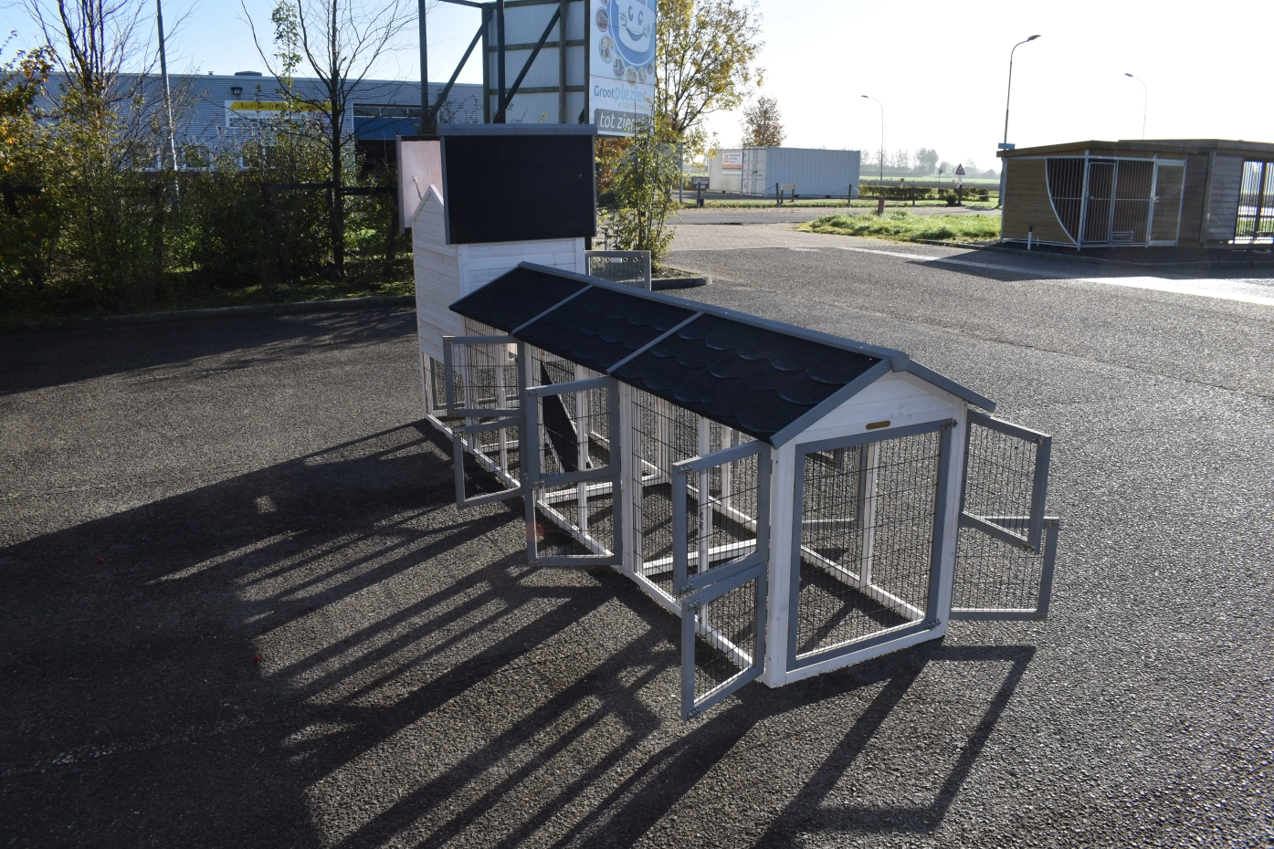 Kaninchenstall Prestige Medium ist ein schöne Stall mit Nageschutzstreifen, große Türen und gummi Füßen. Diese Stall hat ein groß Schlafraum und ein große Auslauf. Die max. Abmessungen sind 398x90x150cm . Diese Stall kann, mit ein kleine Anpassung, spiegelverkehrt aufgebaut werden.