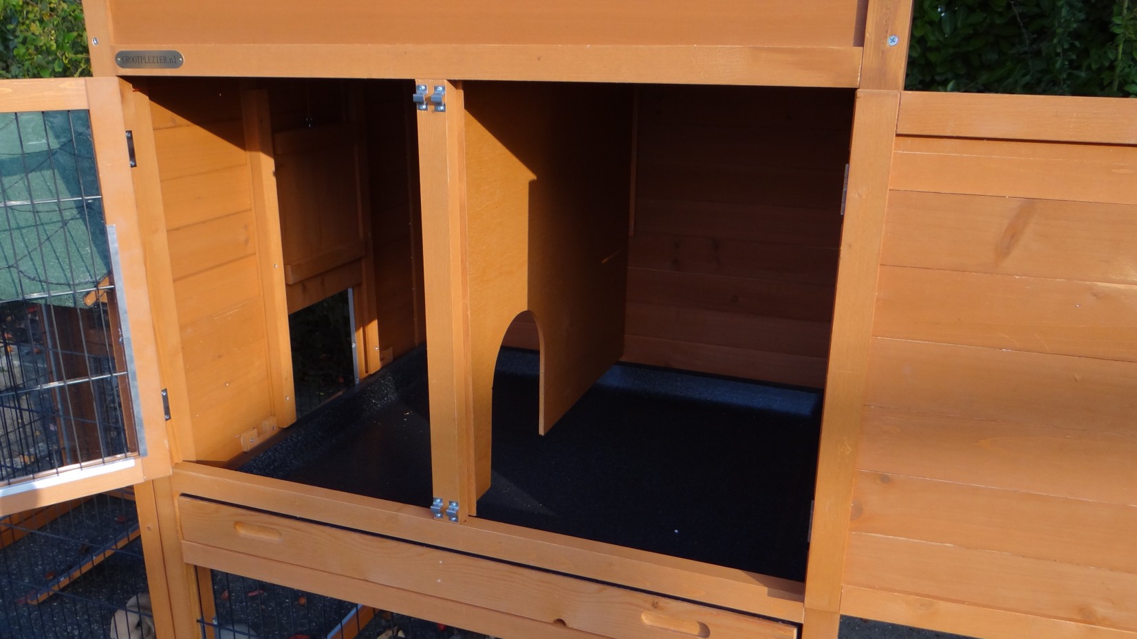 - Dieser Kaninchenstall ist mit einem Nistkasten ausgestattet