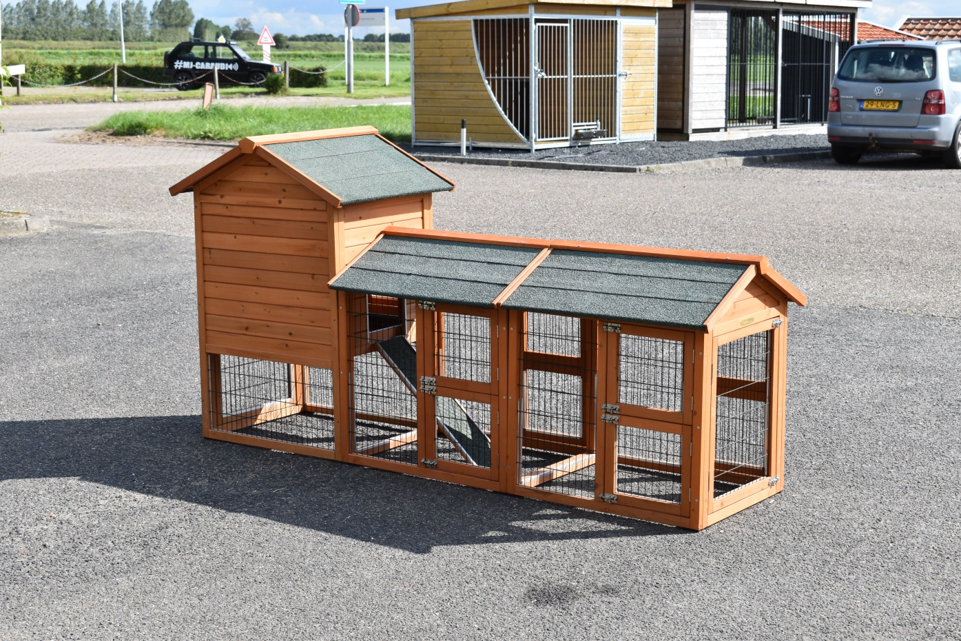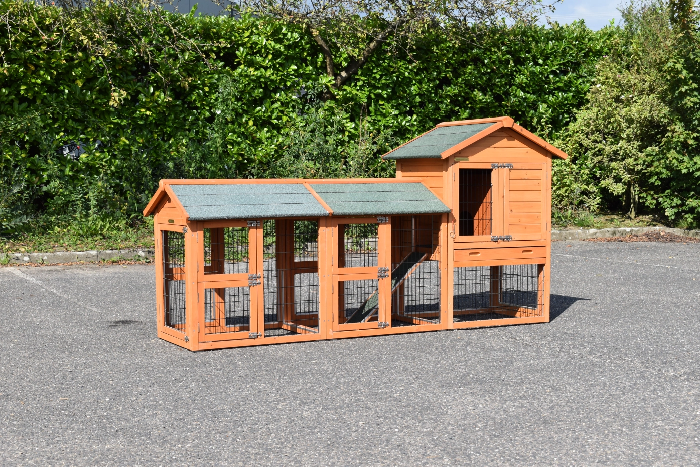 Kaninchenstall Prestige Small ist erweitert mit 2 Ausläufe Space Small. Der Stall hat viele Türen und eine Schublade, um der Stall leicht zu können reinigen. Diese Stall hat auch ein praktisch Stauraum, um zB. Kaninchenfutter zu lagern. Der Stall ist geeignet für 2 Kaninchen. Die maximale Abmessungen, inklusives Dach, sind 238x72x122cm.
