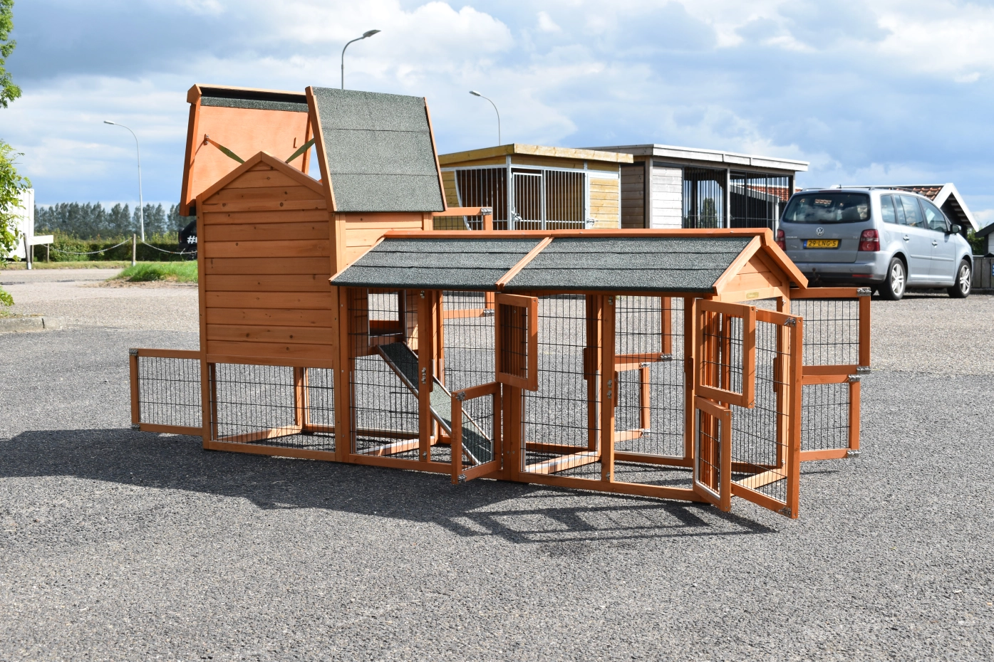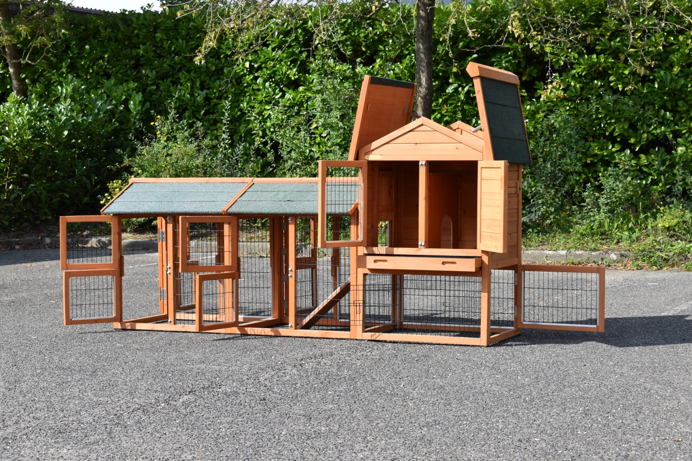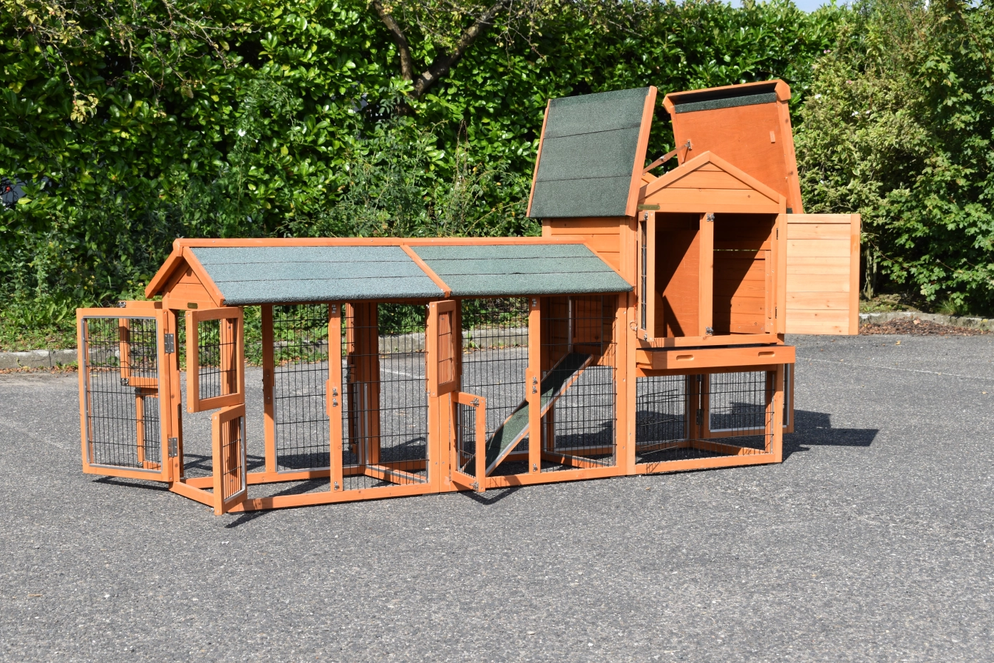 - Um diesen Stall mit einem Auslauf zu kombinieren, muss eine Tür oder ein Gitterteil entfernt werden.