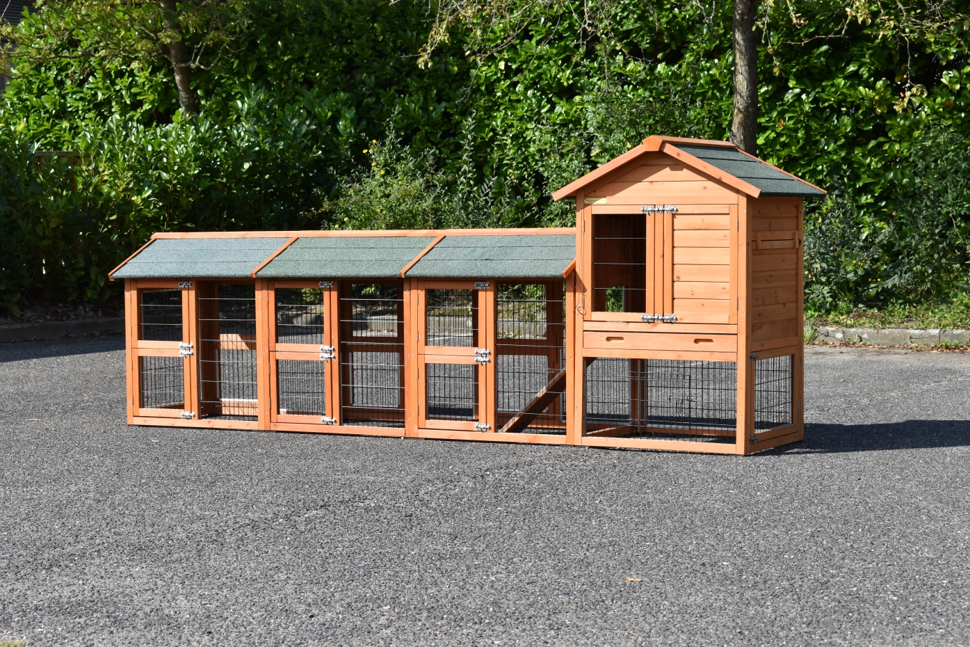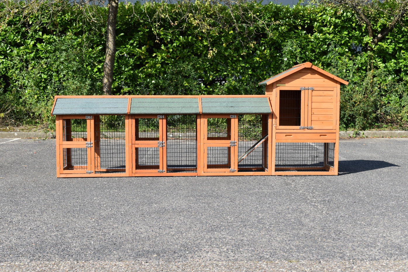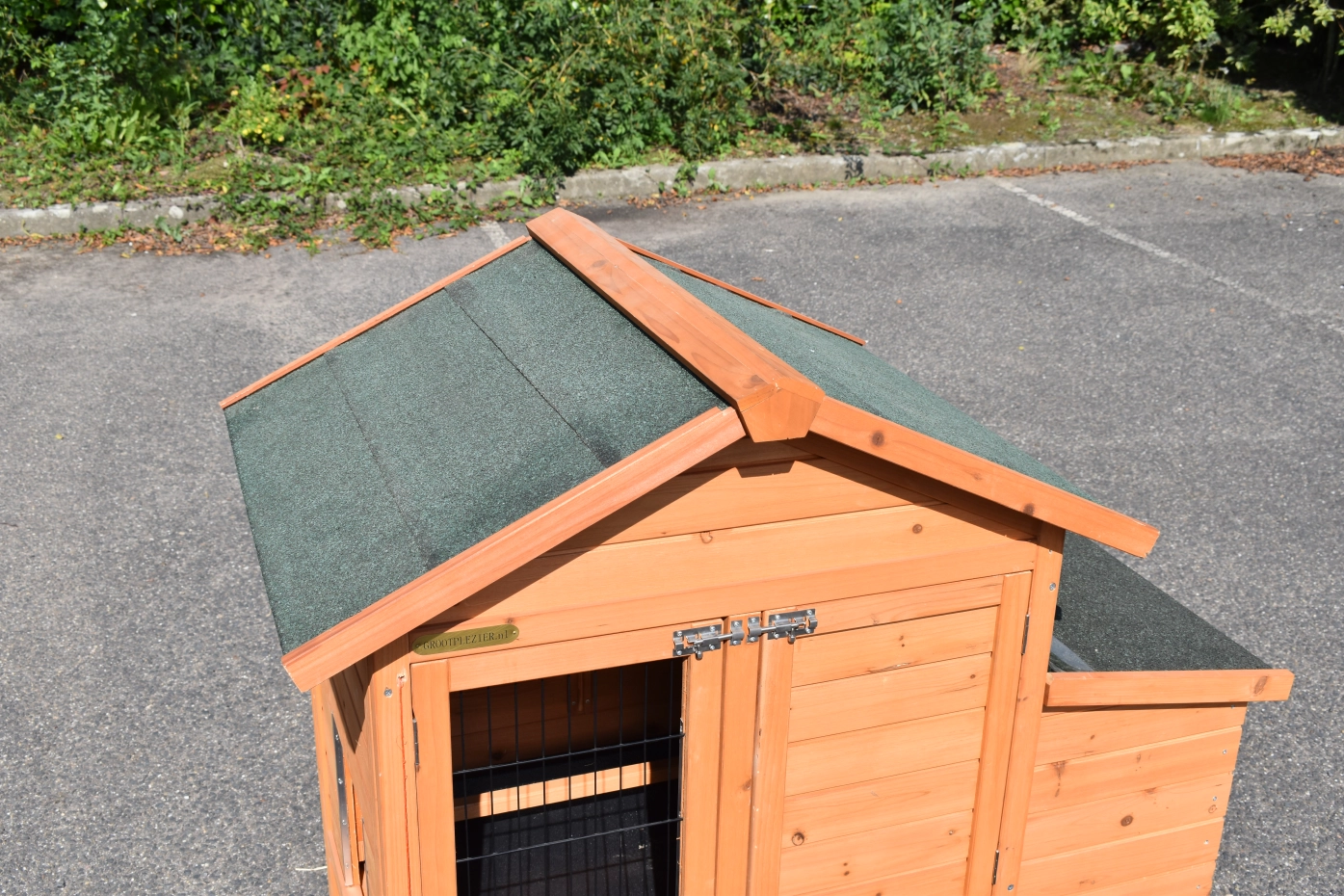 - Das Dach dieses Kaninchenstalls ist mit Dachpappe versehen.