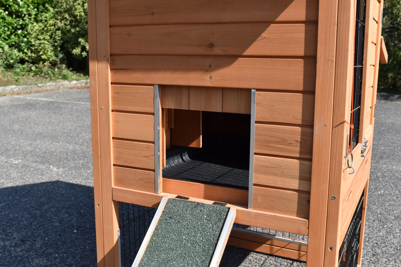 - Die Türen dieses Kaninchenstalls sind mit doppelten Schieberiegeln ausgestattet