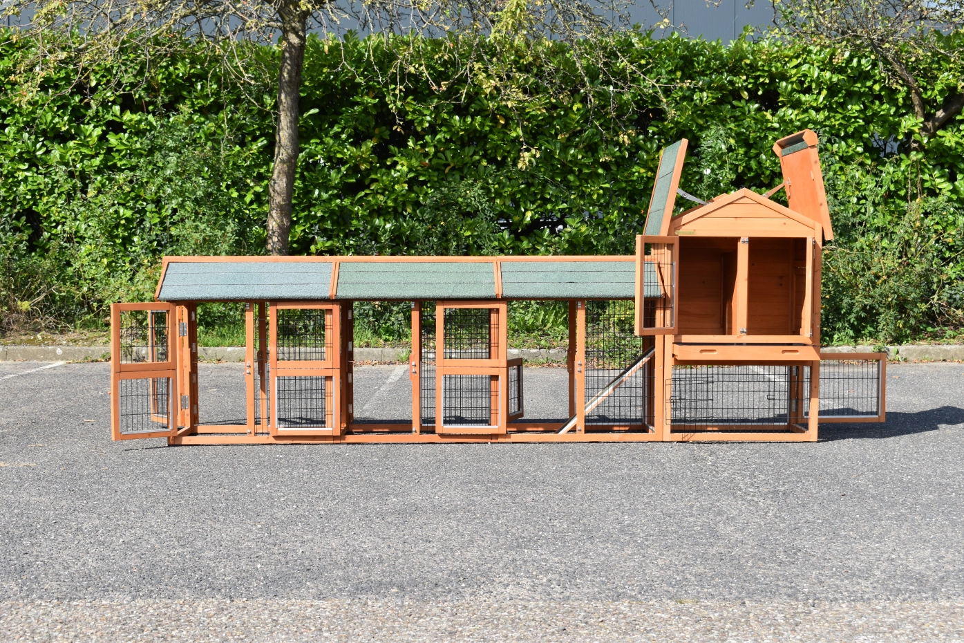 - Um diesen Stall mit einem Auslauf zu kombinieren, muss eine Tür oder ein Gitterteil entfernt werden.