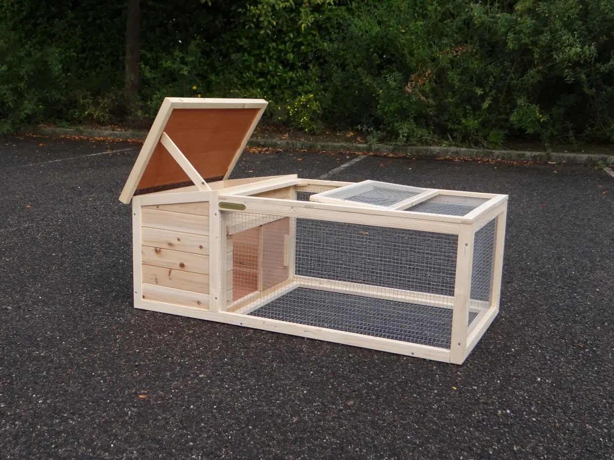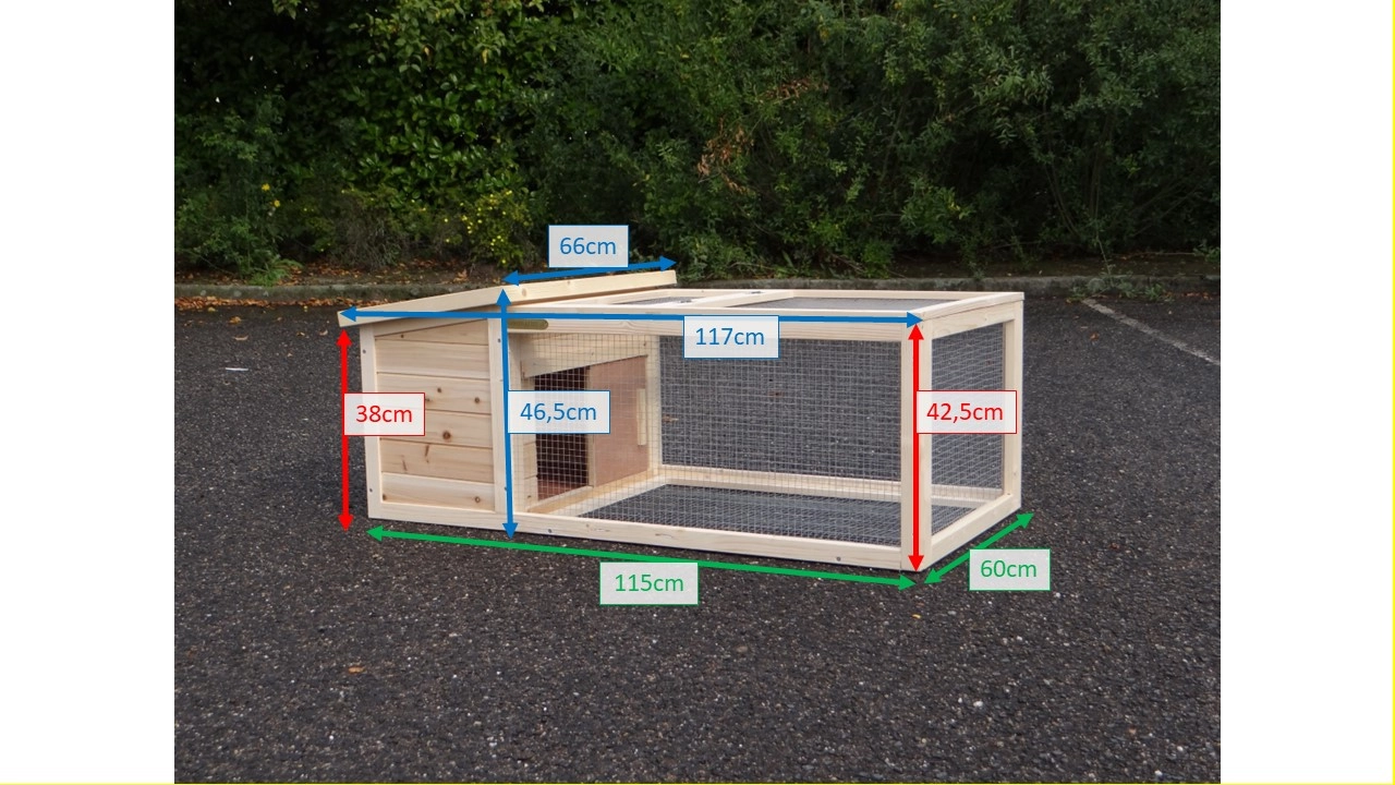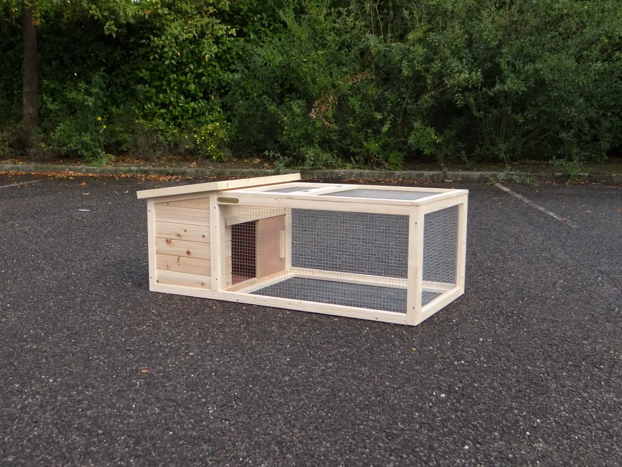 Der kleines Kaninchenstall Lily ist geeignet für ein Zwergkaninchen oder ein Meerschweinchen. Der Stall ist leicht beweglich. Der Auslauf hat ein Gitterboden und ein Klappdach. Der Schlafraum has ein heausnehmbare Holzboden und ein Klappdach mit Dachpappe.
