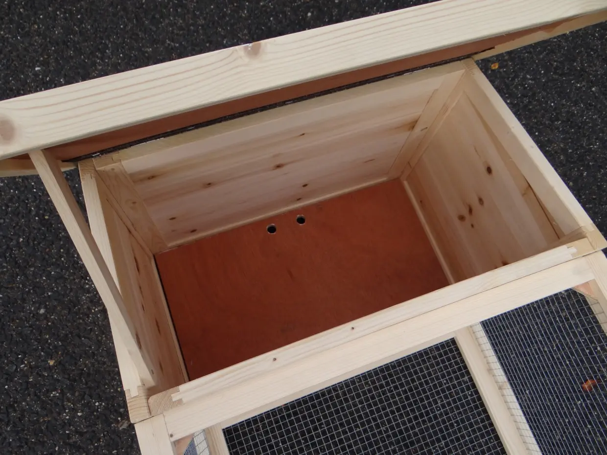 - Das Dach dieses Kaninchenstalls ist mit Dachpappe versehen.