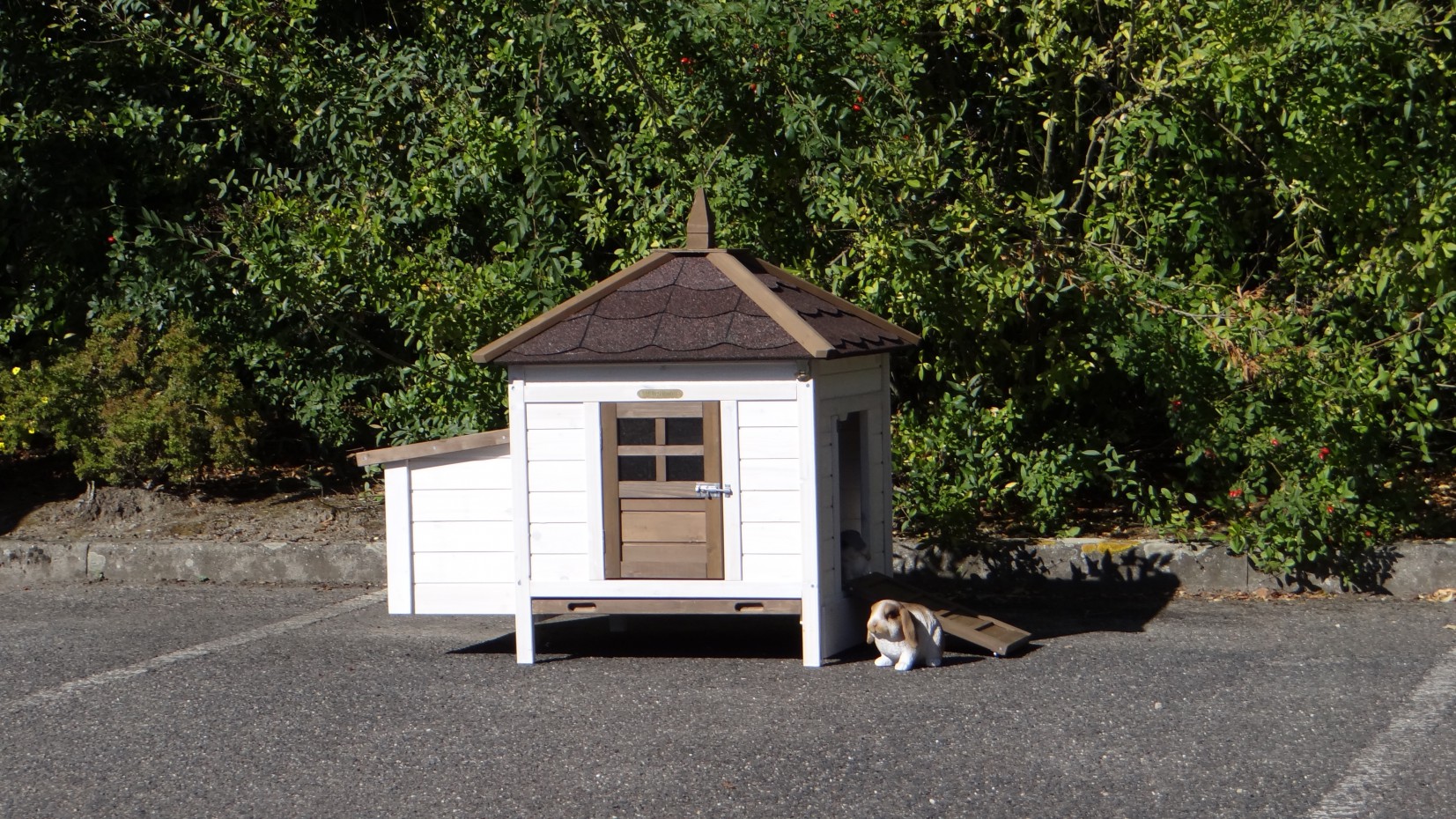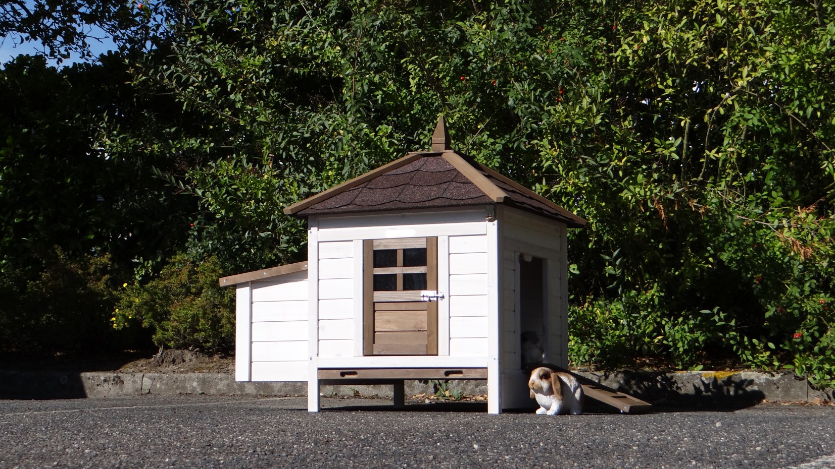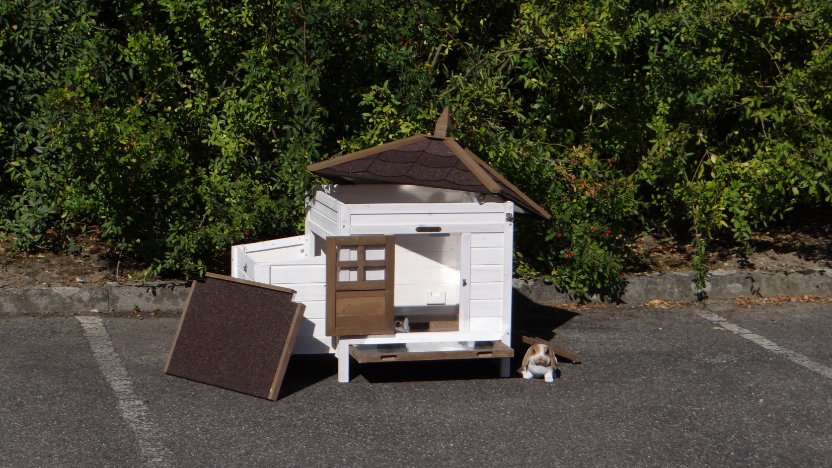- Das Dach dieses Kaninchenstalls ist mit Dachpappe versehen.