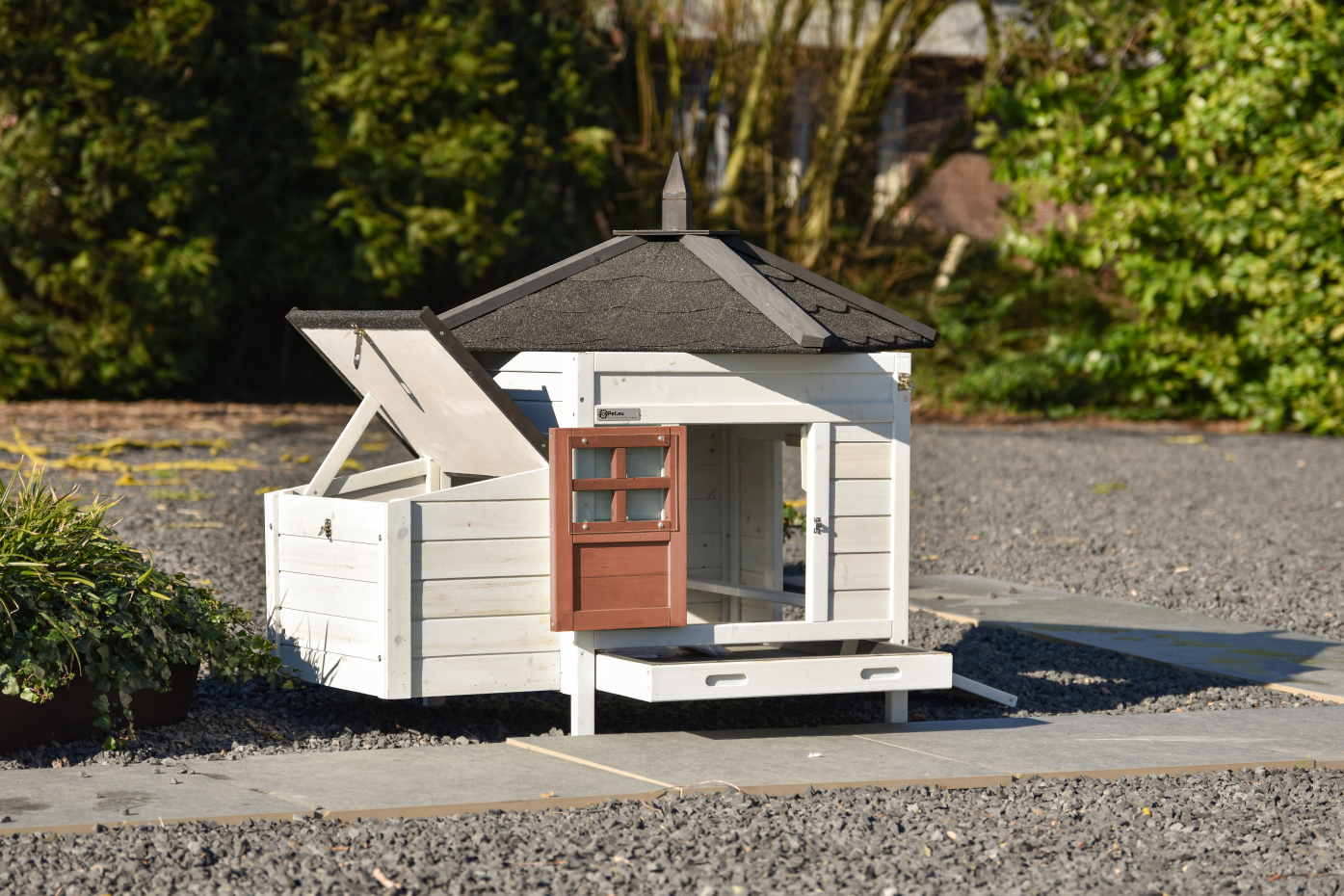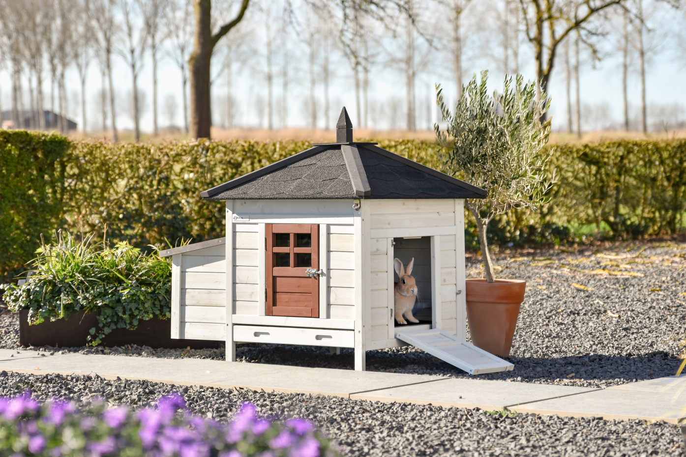 Kaninchenstall Ambiance Small ist ein echter Blickfang im Garten und verbindet eine schöne Optik mit praktischem Gebrauch. Der Stall hat eine Kunststoff-Schublade, ein vollständig abnehmbares Dach zum einfachen Reinigen und eine Seitentür, die auch als Rampe dient. Der Stall passt gut in einen großen Kaninchenauslauf, kann aber auch mit Anbau-Ausläufen erweitert werden, die speziell für dieses Modell gemacht sind
