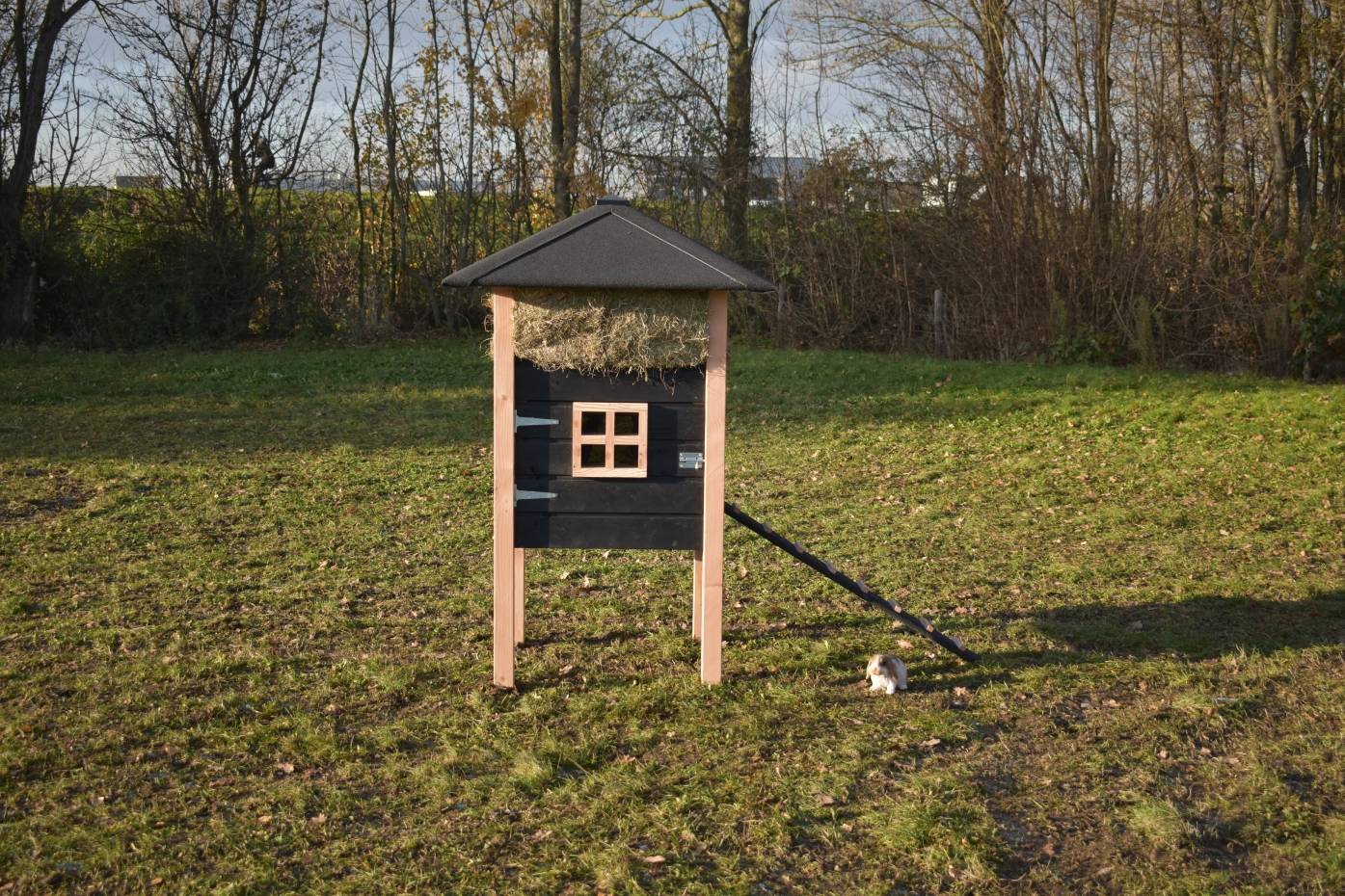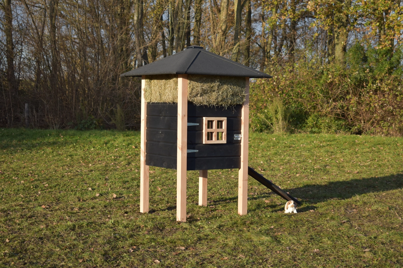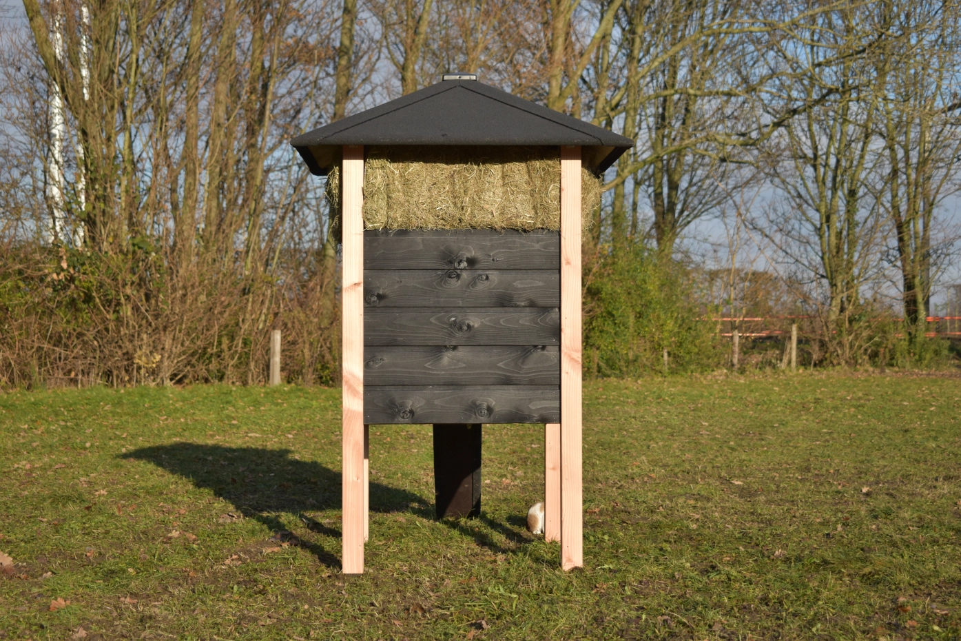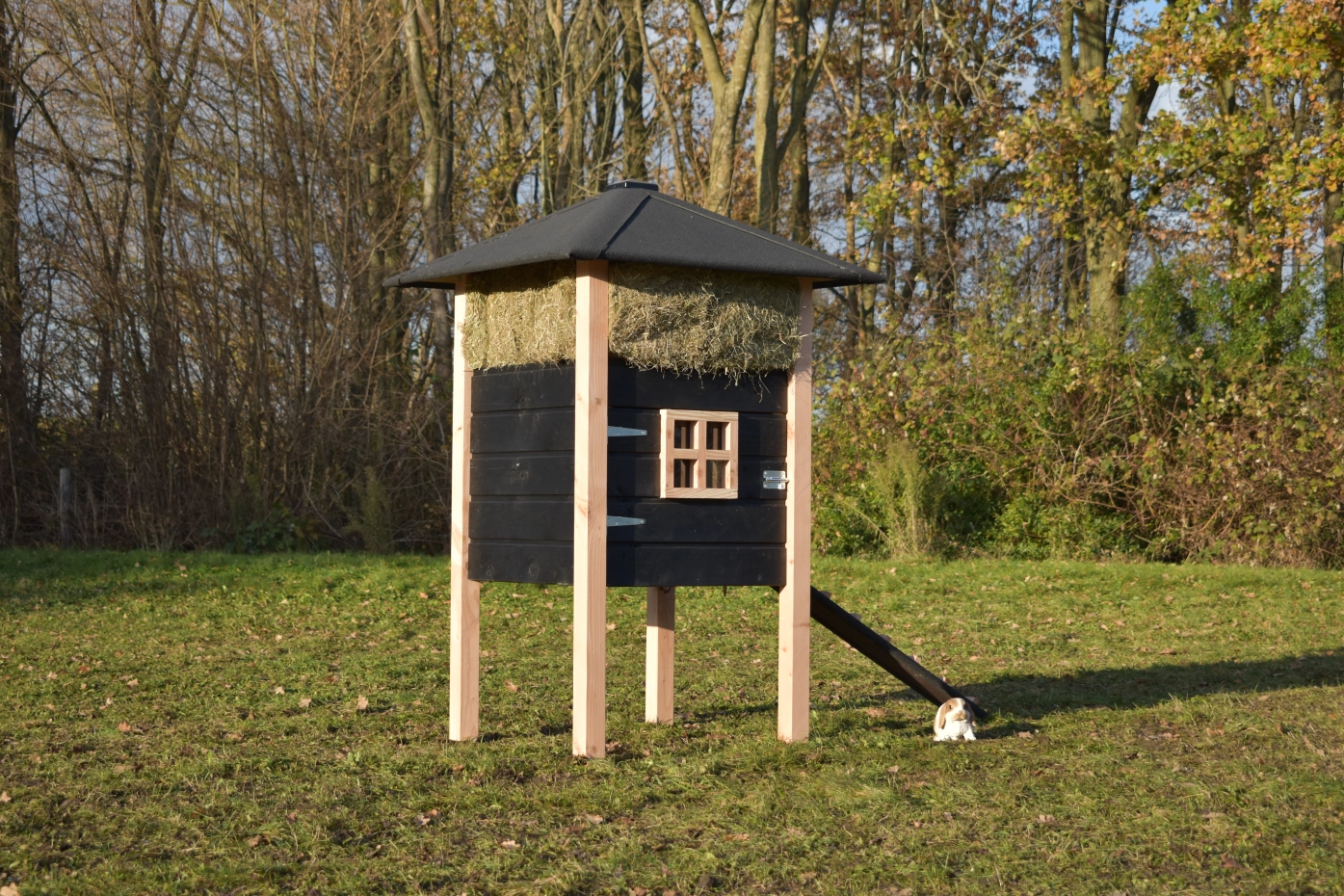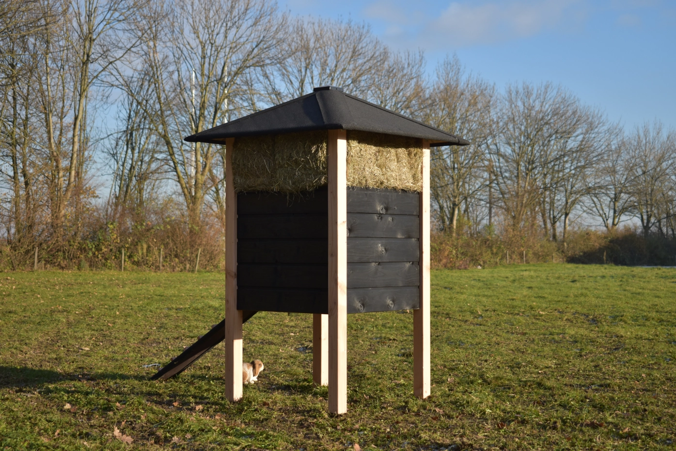Kaninchenstall Heuhaufen Rosanne ist herstellt aus Douglasienholz und schwarz imprägniertes Fichtenholz. Sie können das Heu mitbestellen. Durch der große Tür können Sie der Schlafraum leicht reinigen. Diese Stall is auch verfügbar mit Dachschindeln.