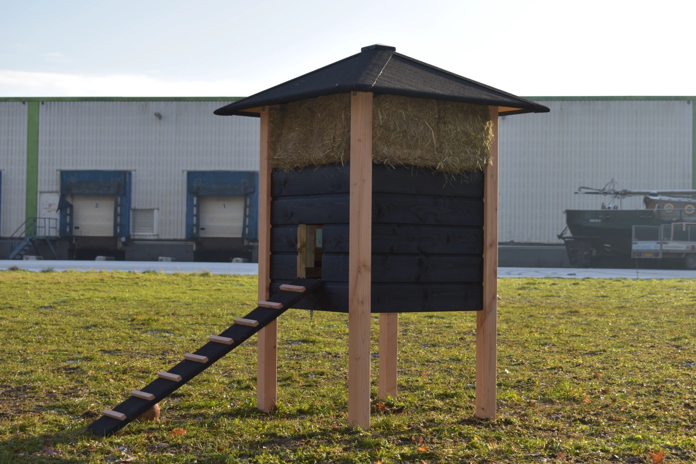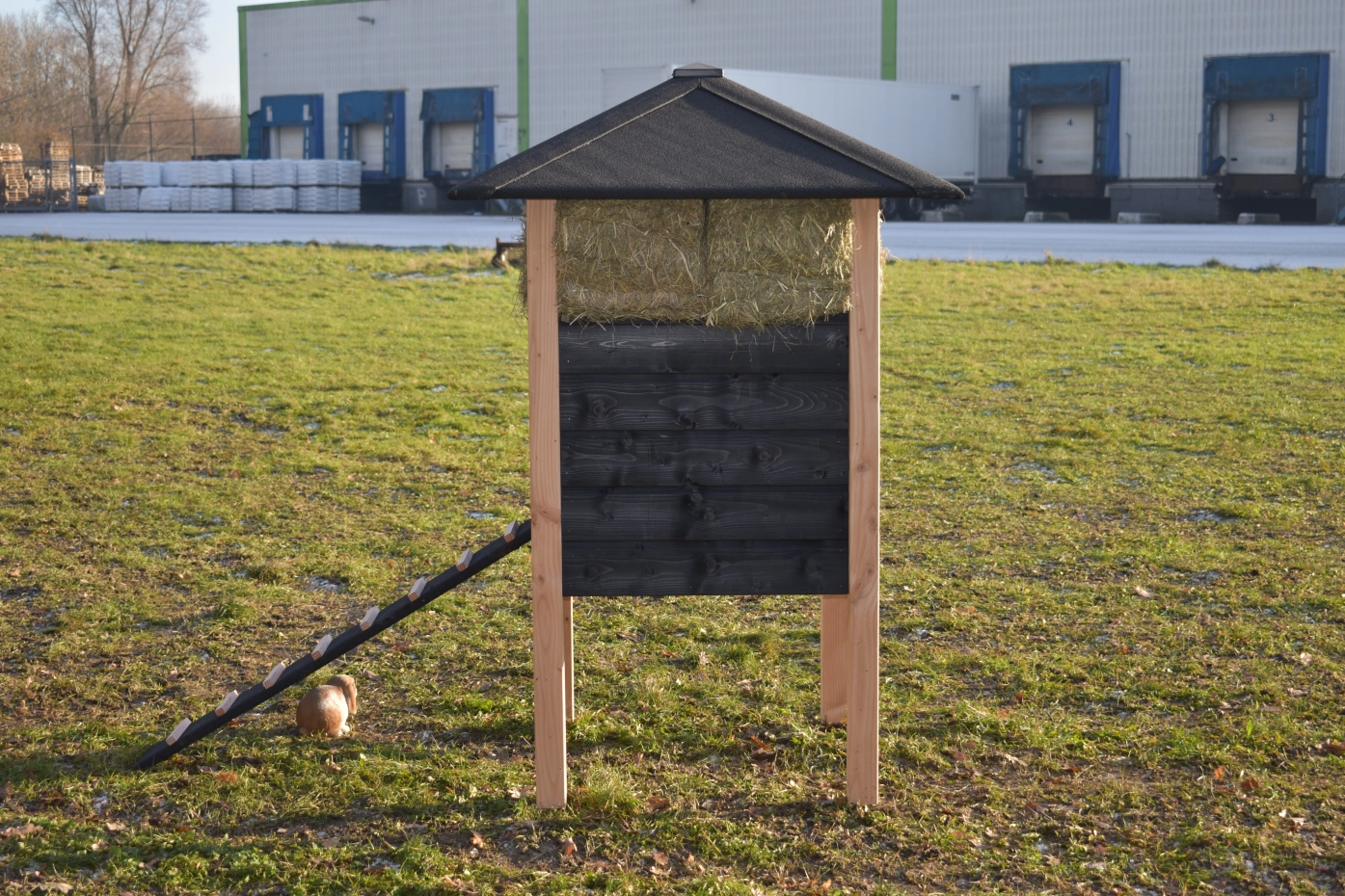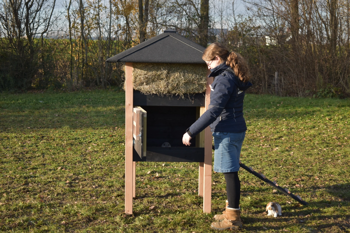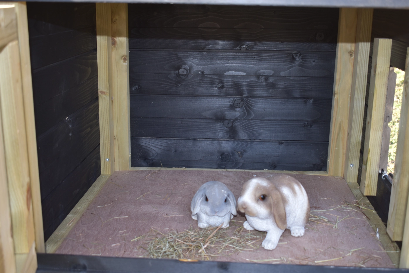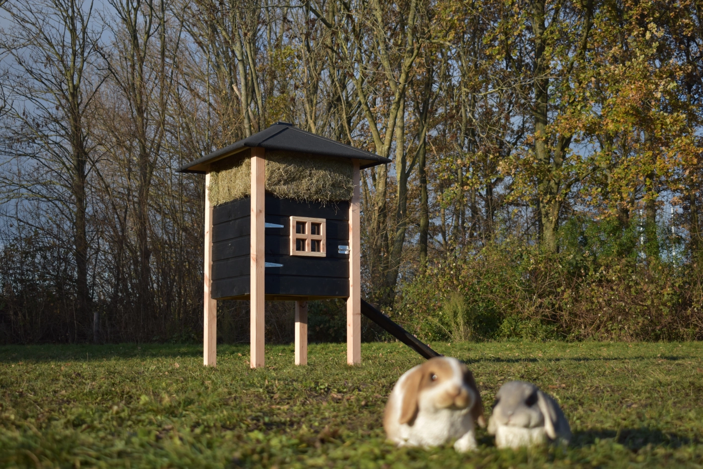 Kaninchenstall Heuhaufen Rosanne ist herstellt aus Douglasienholz und schwarz imprägniertes Fichtenholz. Sie können das Heu mitbestellen. Durch der große Tür können Sie der Schlafraum leicht reinigen. Diese Stall is auch verfügbar mit Dachschindeln.