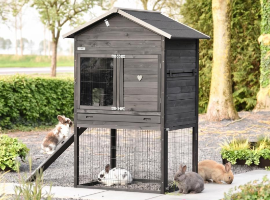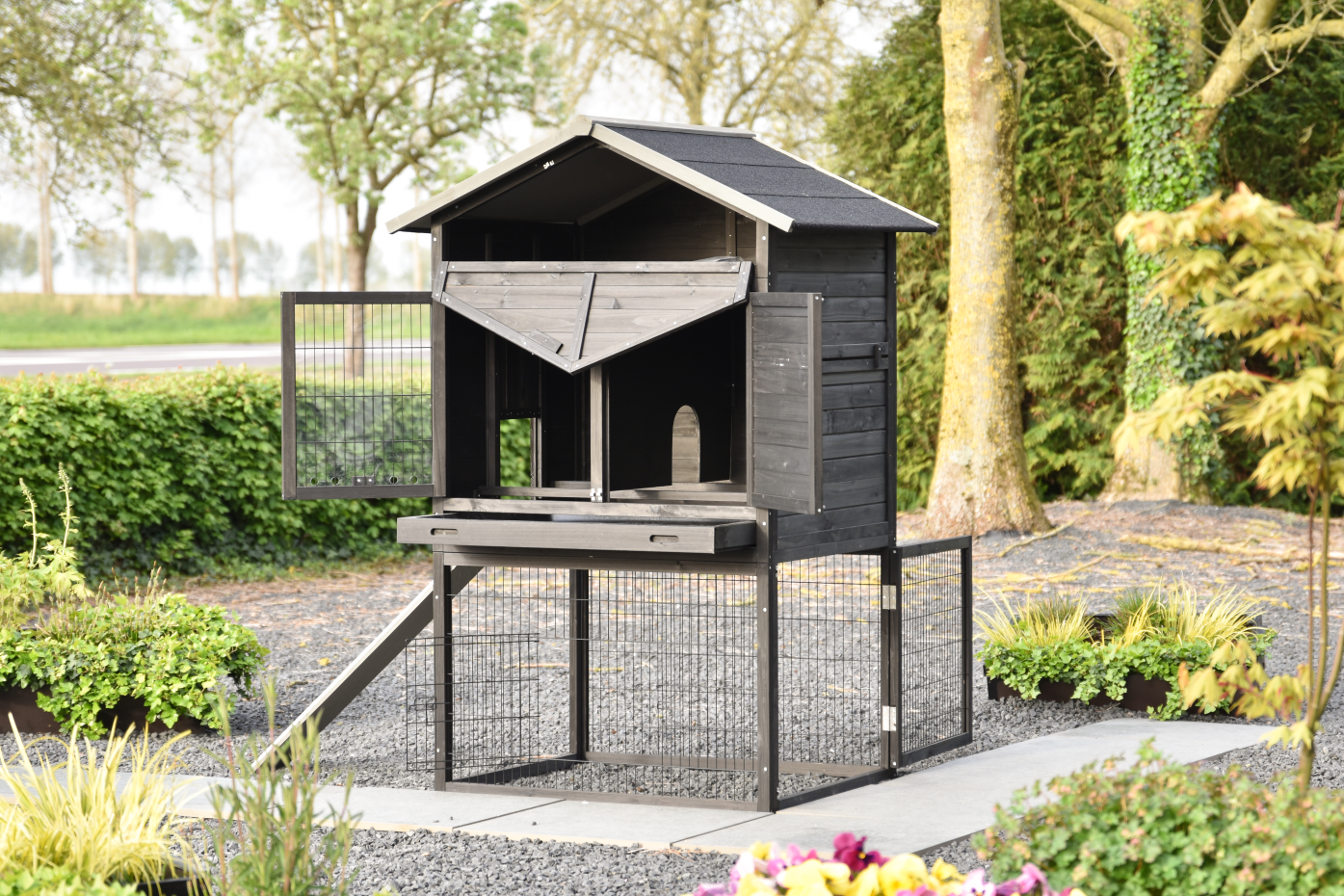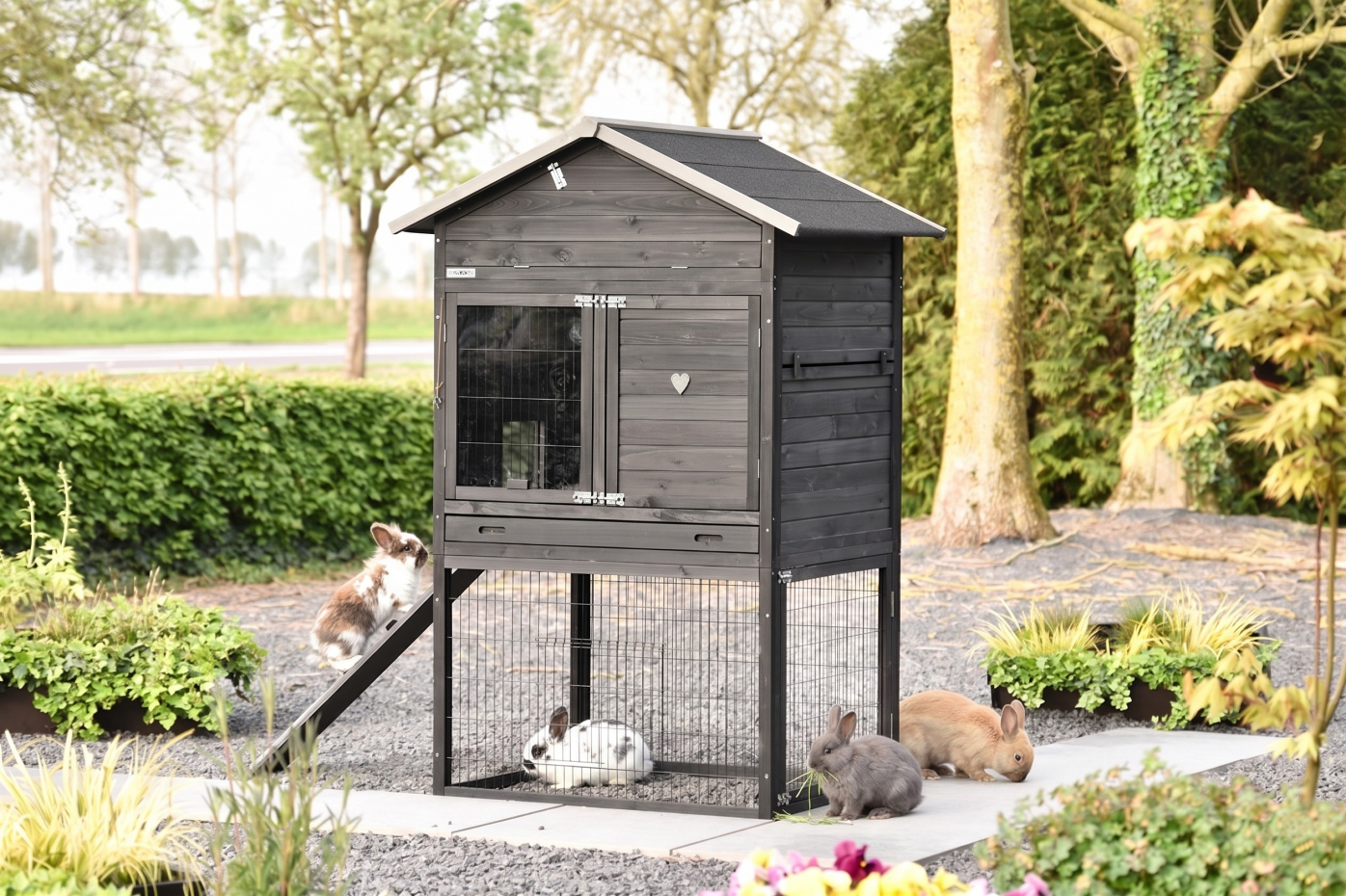 Ein geräumiger und praktischer Kaninchenstall, in dem sich Ihre Kaninchen sofort wohlfühlen Das großzügige Schlafhaus sorgt für Komfort und Ruhe, während die großen Türen die Pflege erleichtern Dieses kompakte Schlafhaus ist ideal für die Platzierung in einem großen Auslauf oder auf einer Wiese, sodass Ihre Kaninchen ausreichend Bewegungsfreiheit haben Dank der Gummifüße ist der Stall vor aufsteigender Feuchtigkeit geschützt Außerdem lässt sich der Kaninchenstall einfach mit bestehenden Ausläufen kombinieren, sodass Sie das Ganze endlos erweitern können
