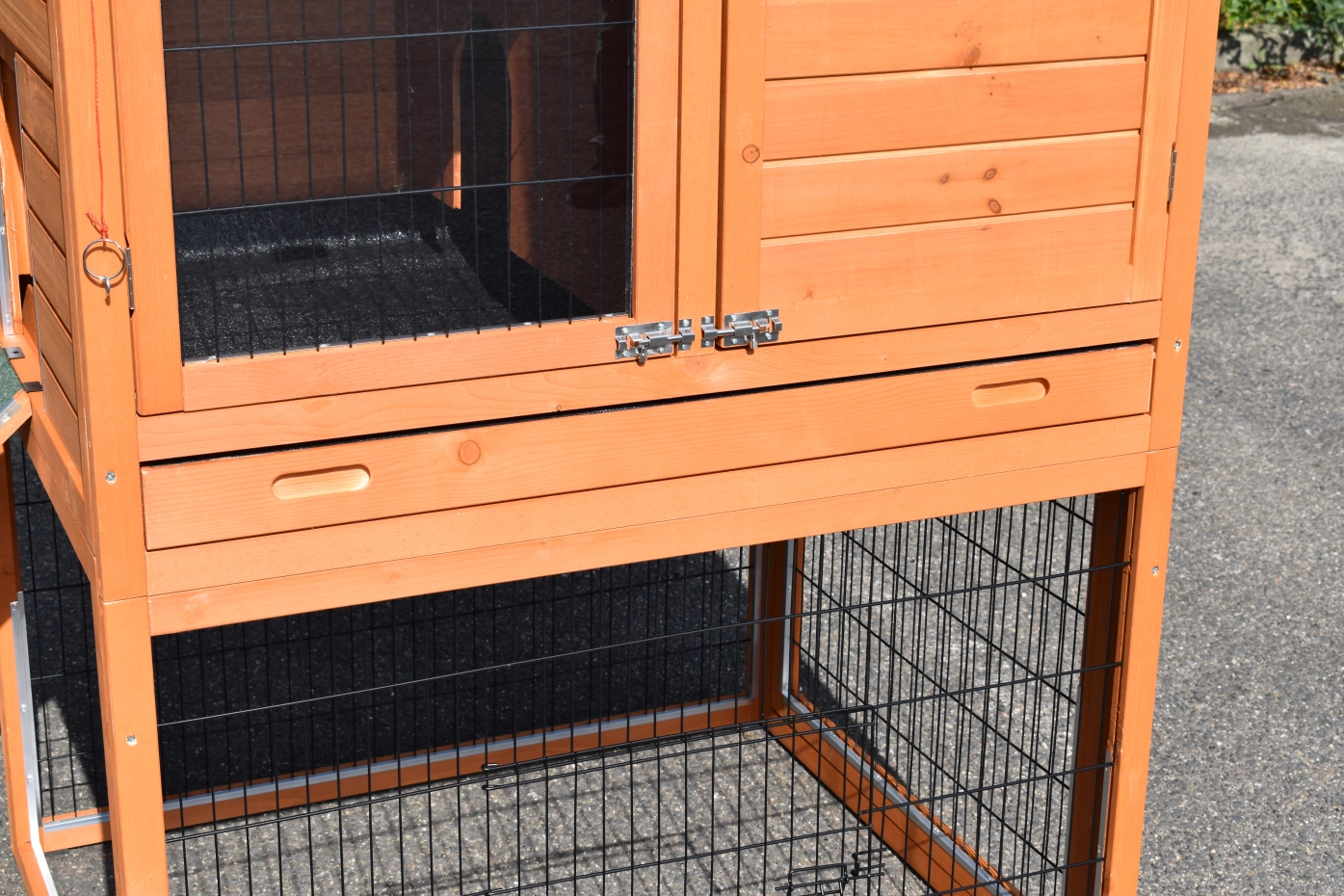 - Die Türen dieses Kaninchenstalls sind mit doppelten Schieberiegeln ausgestattet