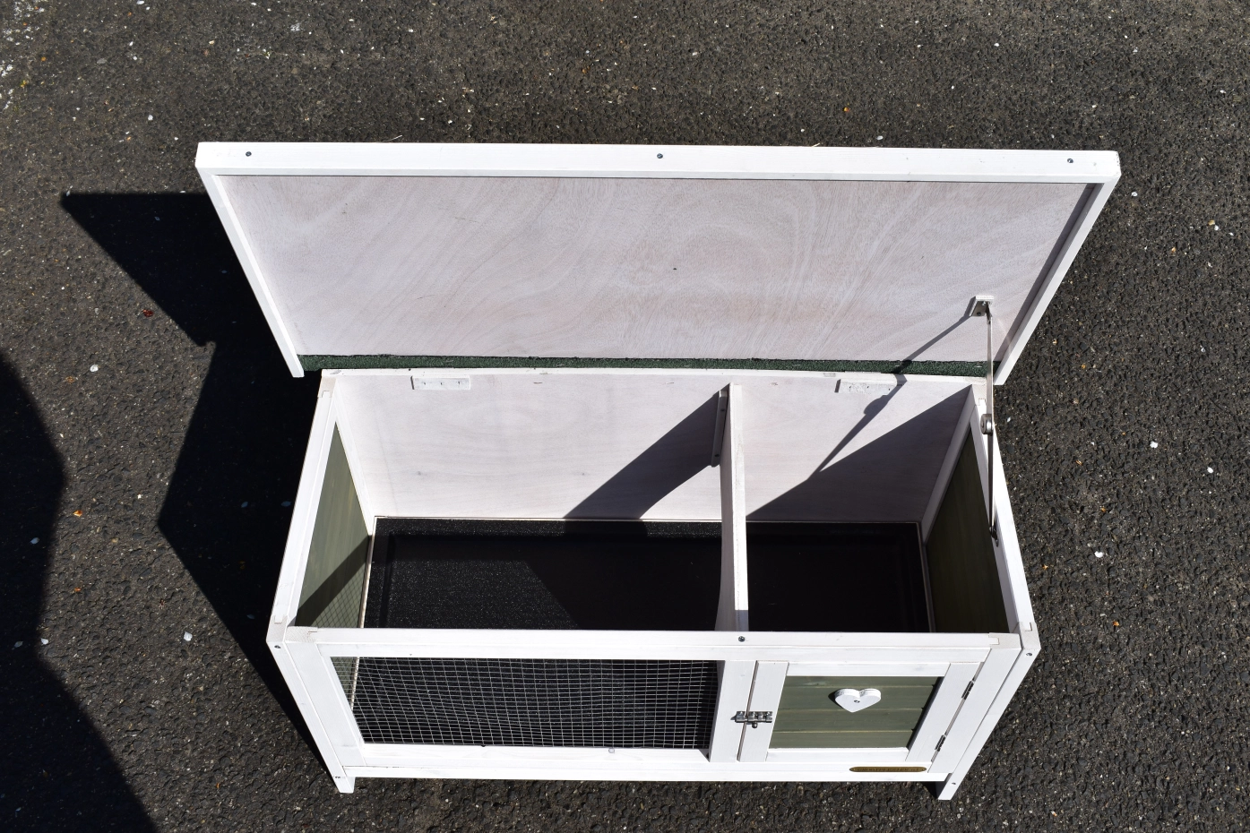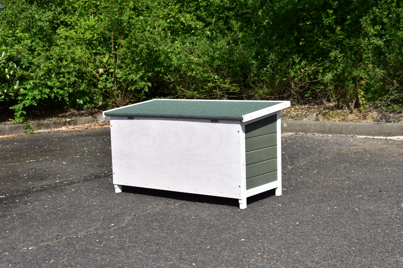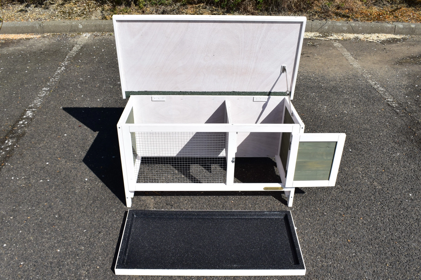 • Das Dach dieses Kaninchenstalls ist mit Dachpappe versehen.