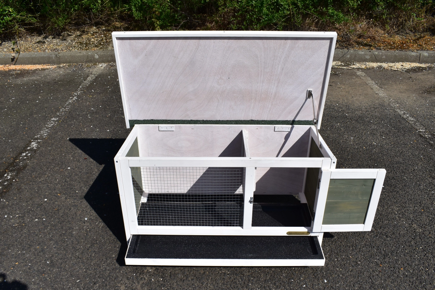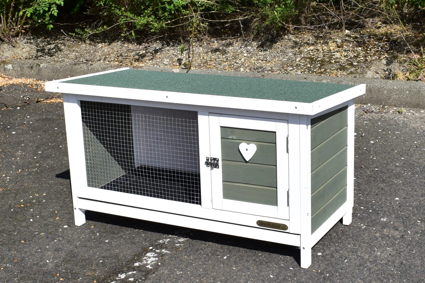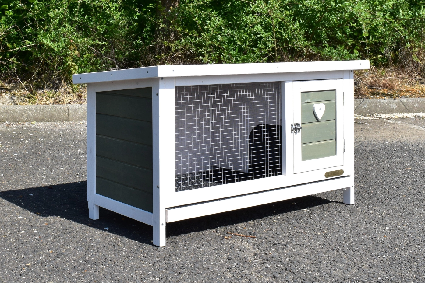 • Das Dach dieses Kaninchenstalls ist mit Dachpappe versehen.
