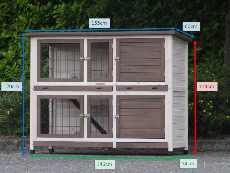 Der doppelstöckiger Meerschweinchenstall Annely besitzt vierbesonders tiefe, herausziehbare Kotwannen und große Türen. Spaß für Meerschweinchen auf 2 Etagen! **Dieser Käfig hat ein relativ steile Rampe, aber die beiden Etagen sind trennbar durch eine Dachbodenluke. Der Stall hat 2 Schlafräume.