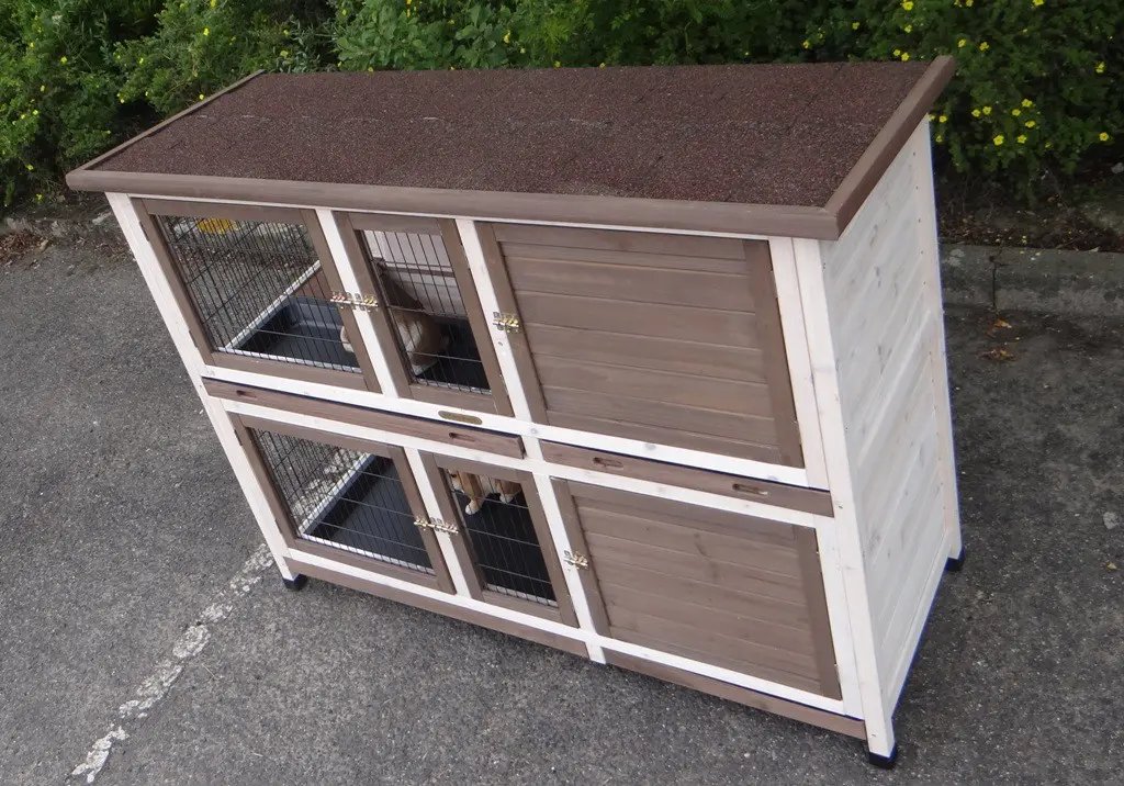 - Das Dach dieses Kaninchenstalls ist mit Dachpappe versehen.