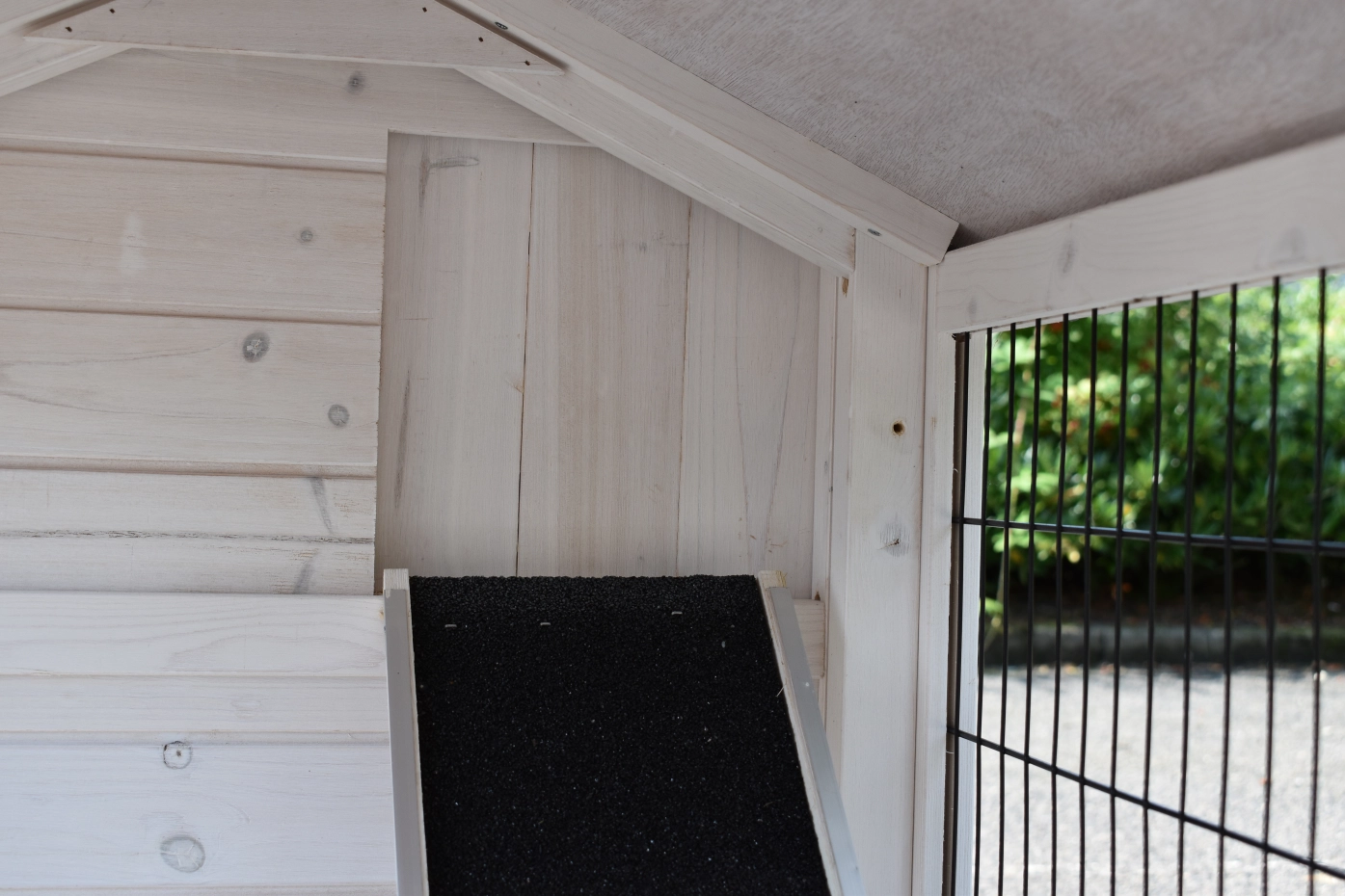 - Der Auslauf hat ein Drahtdach