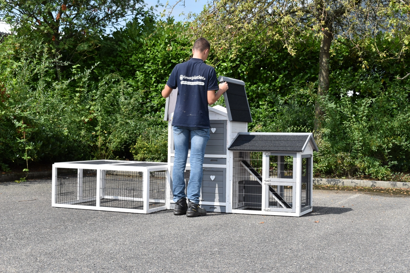 - Um diesen Stall mit einem Auslauf zu kombinieren, muss eine Tür oder ein Gitterteil entfernt werden.