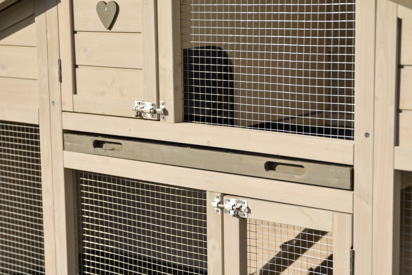 - Die Türen dieses Kaninchenstalls sind mit doppelten Schieberiegeln ausgestattet