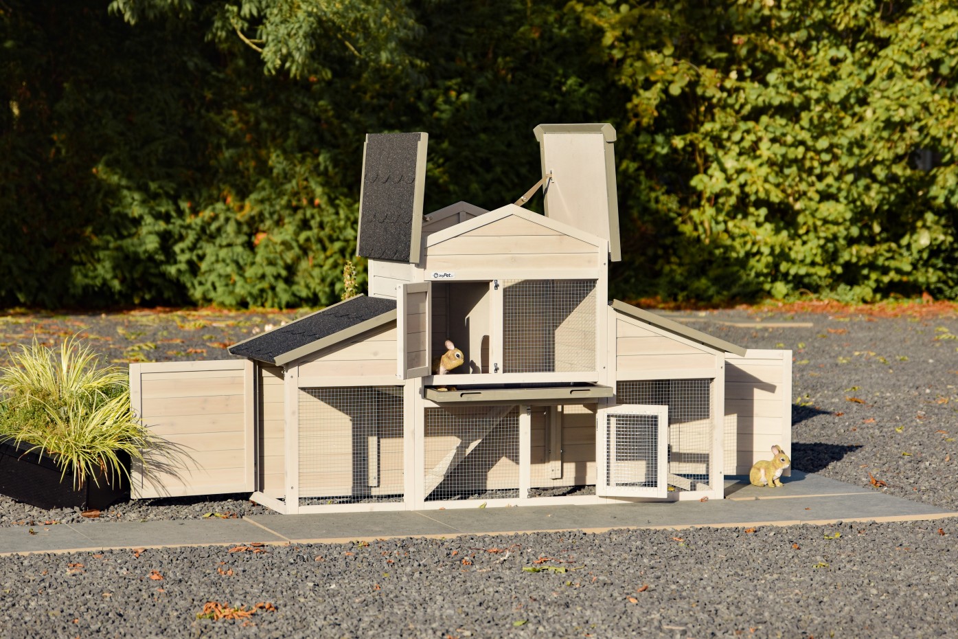 Kaninchenstall Annemieke mit massiver Rückwand und Seitenteilen mit geräumigen Türen. Diese wunderschöne Kaninchenvilla bietet guten Schutz vor Regen und Wind. Ein Plexiglas-Isolierset ist im Lieferumfang enthalten, um es an den Gitterpaneelen anzubringen und so noch mehr Schutz vor Wind und Regen zu bieten. Der Kaninchenstall Annemieke ist wirklich ein Schmuckstück.