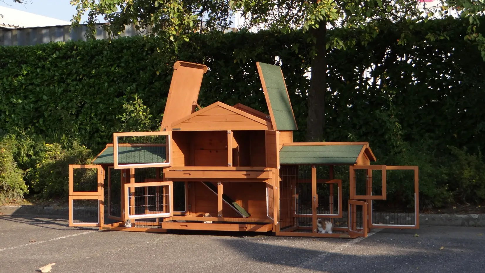 - Das Dach dieses Kaninchenstalls ist mit Dachpappe versehen.