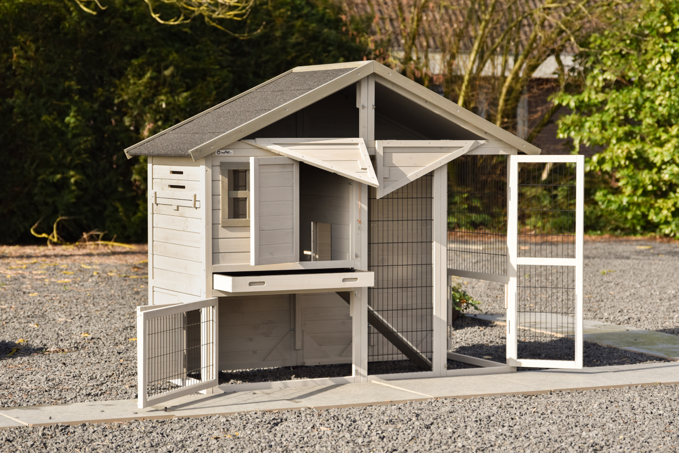 - Die Türen dieses Kaninchenstalls sind mit doppelten Schieberiegeln ausgestattet