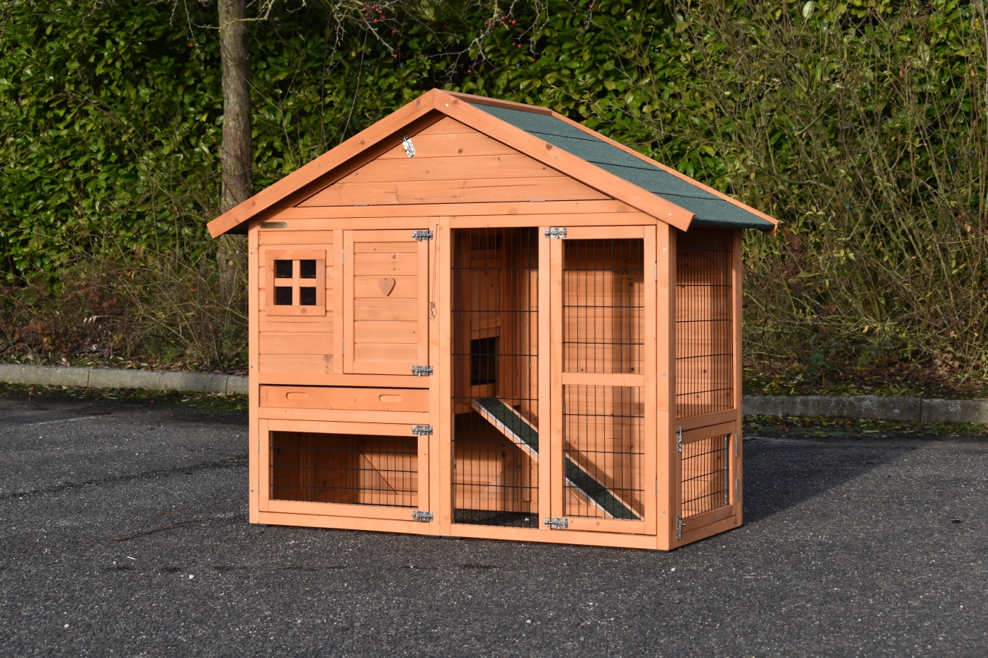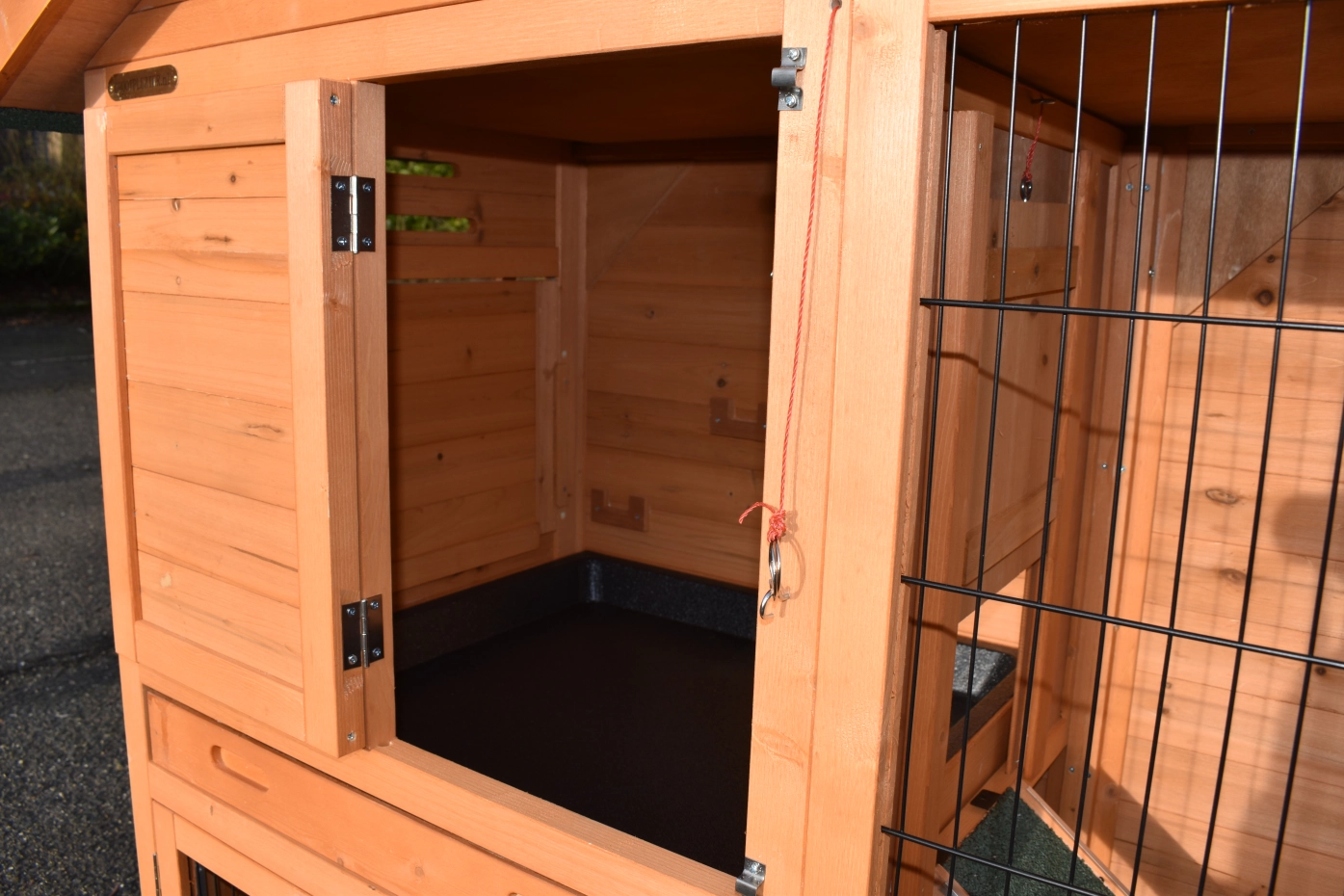 Kaninchenstall Holiday Small ist ein praktische Stall. Der Stall ist ausgestattet mit Nageschutzstreifen, so dass der Kaninchen nicht einfach an das Holz können nagen. Dieser Stall hat große Türen mit Doppelschlösser. Dieser Stall hat gummi Füßen. Dieser Kaninchenstall hat ein tiefe Schublade, um der Schlafraum einfach zu können reinigen, und ein praktisch Stauraum. Das Dach ist ausgestattet mit grüne Dachpappe.