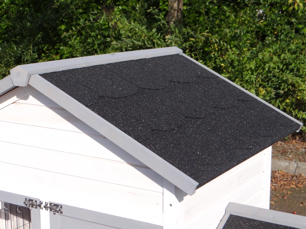 - Das Dach dieses Kaninchenstalls ist mit Dachpappe versehen.