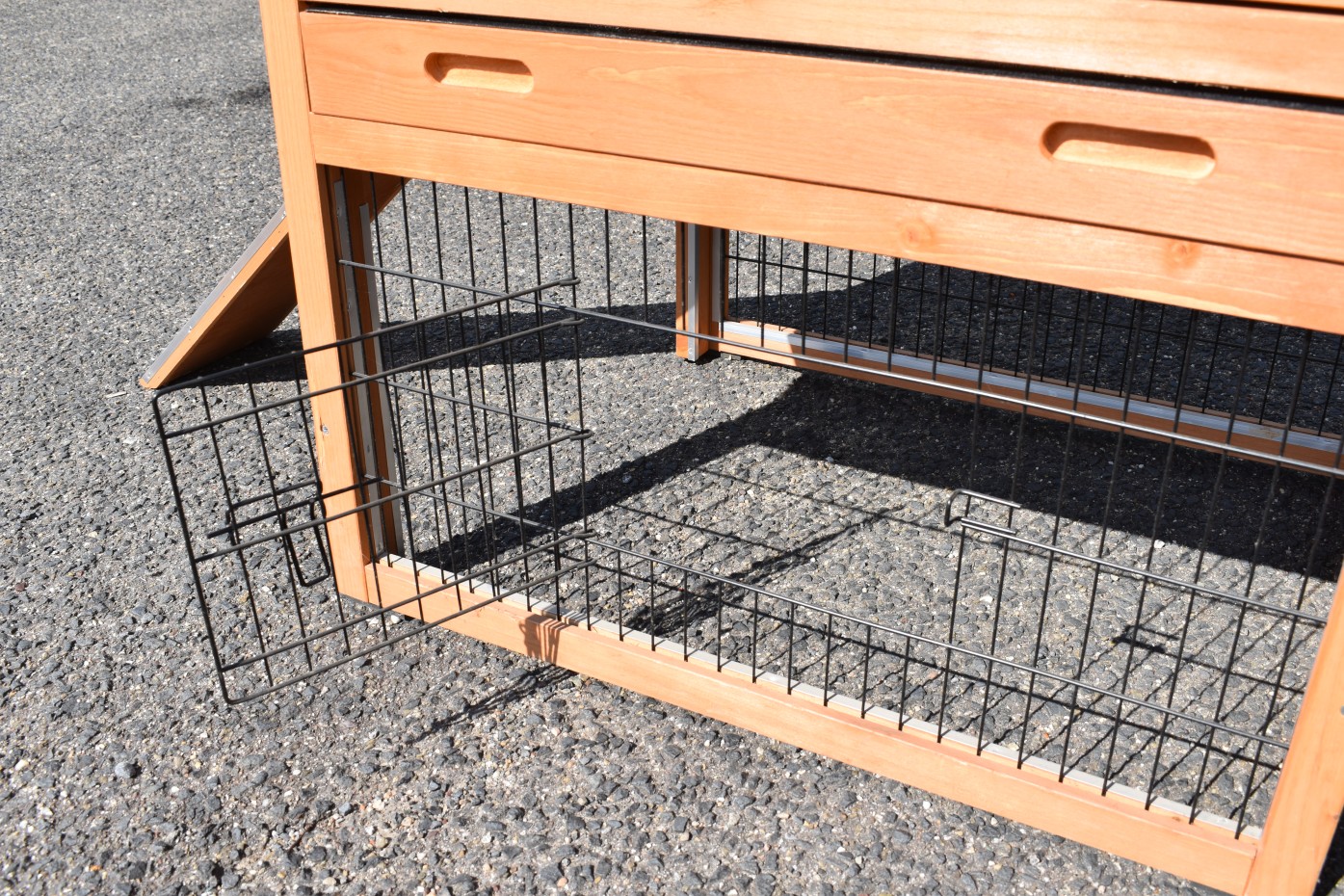 Das Kaninchenhaus Prestige Small mit Auslauf bietet Ihren Kaninchen ein komfortables und sicheres Zuhause. Durch die großen Türen und die praktische herausziehbare Kunststoff-Schublade lässt es sich leicht reinigen. Mit robusten Nageschutzkanten und Gummifüßen. Maße: 162 × 72 × 122 cm.