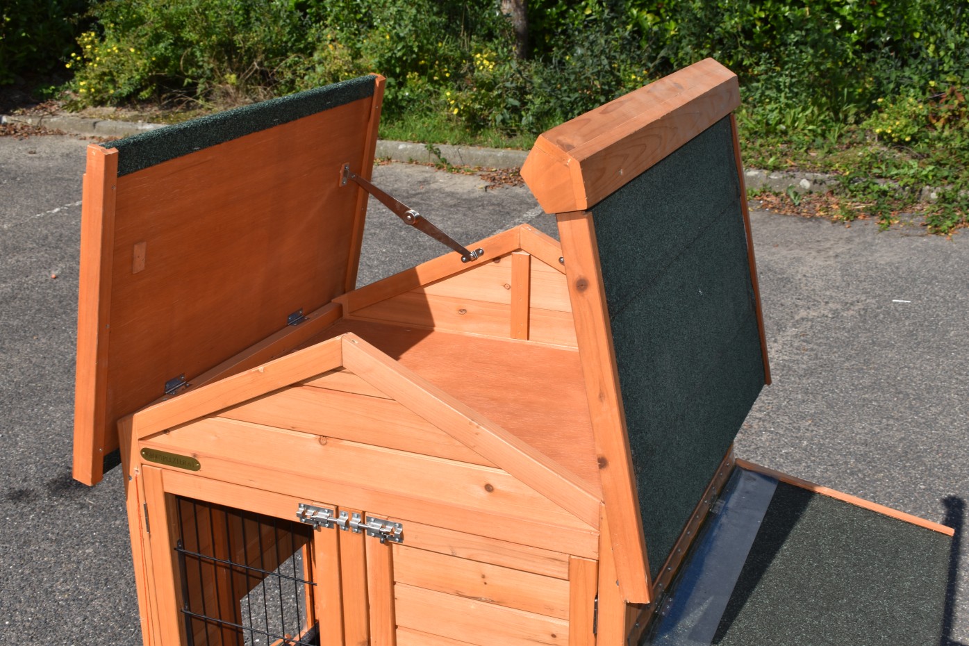 - Das Dach dieses Kaninchenstalls ist mit Dachpappe versehen.