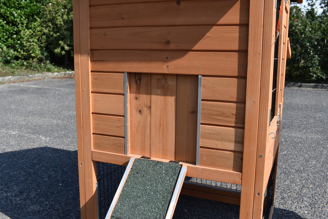 - Die Türen dieses Kaninchenstalls sind mit doppelten Schieberiegeln ausgestattet