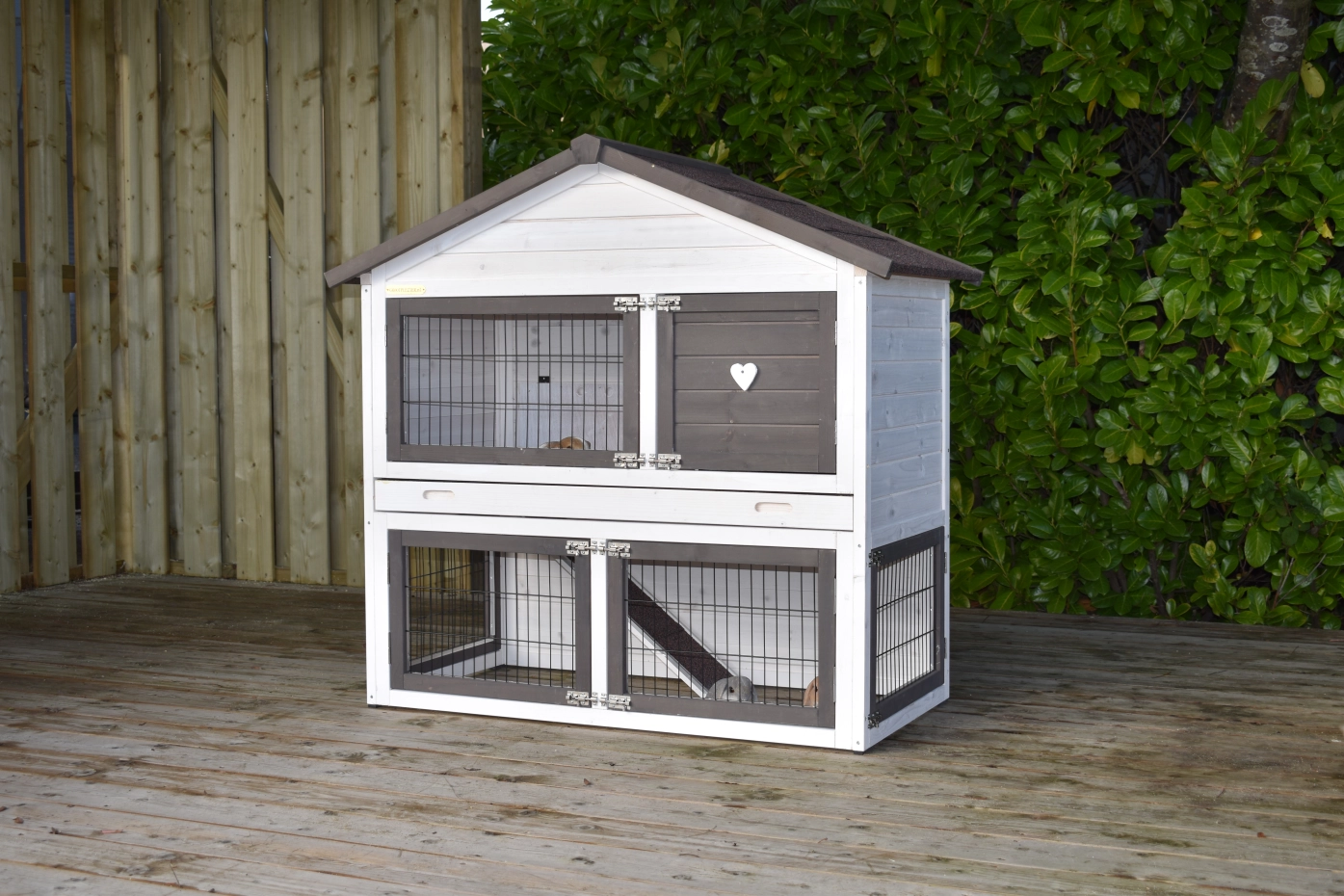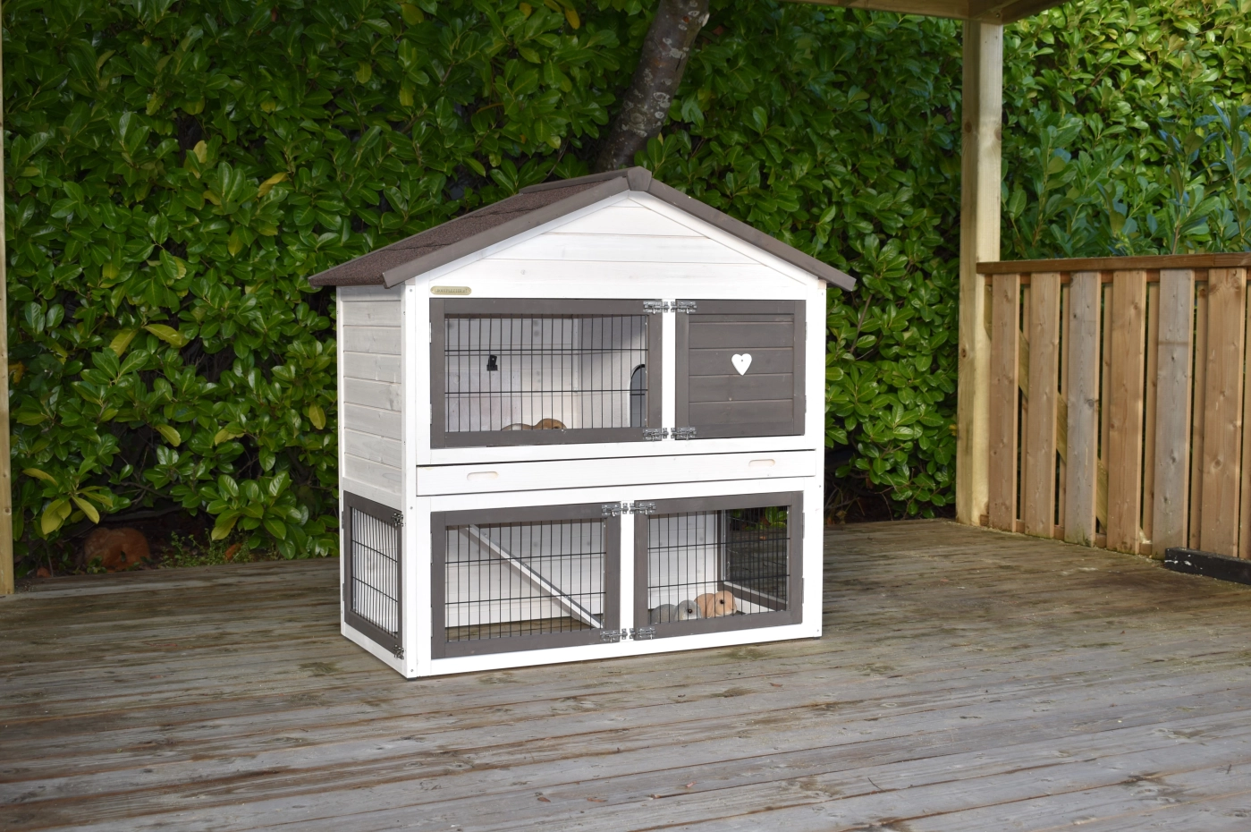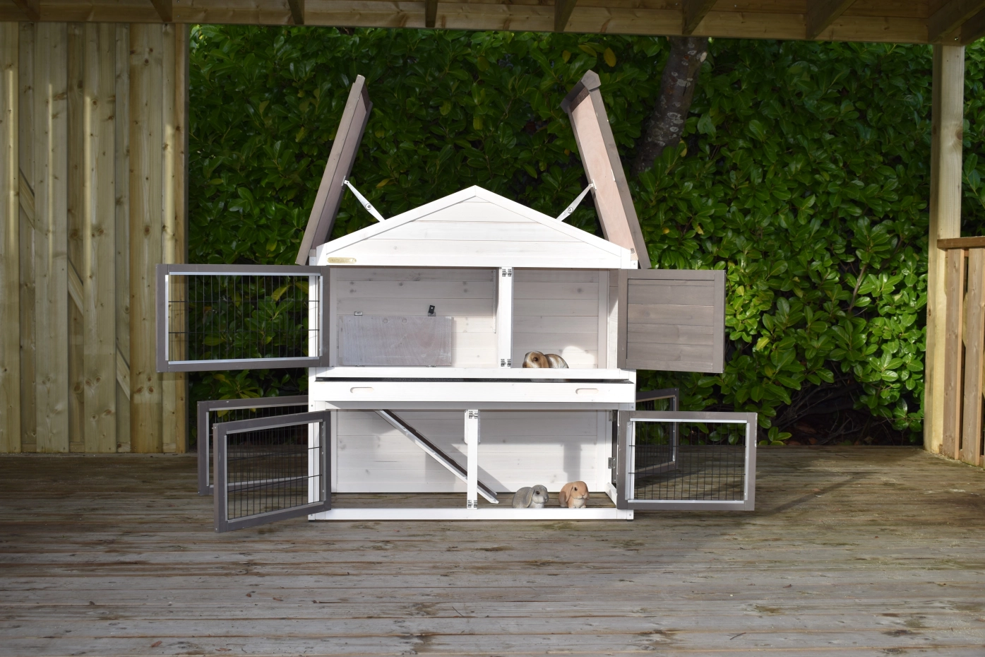 • Die Türen dieses Kaninchenstalls sind mit doppelten Schieberiegeln ausgestattet