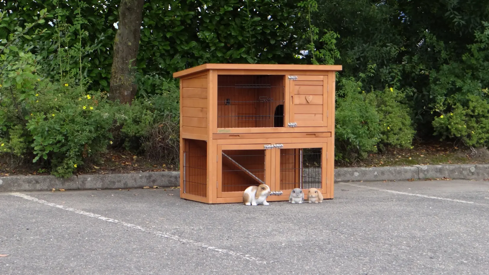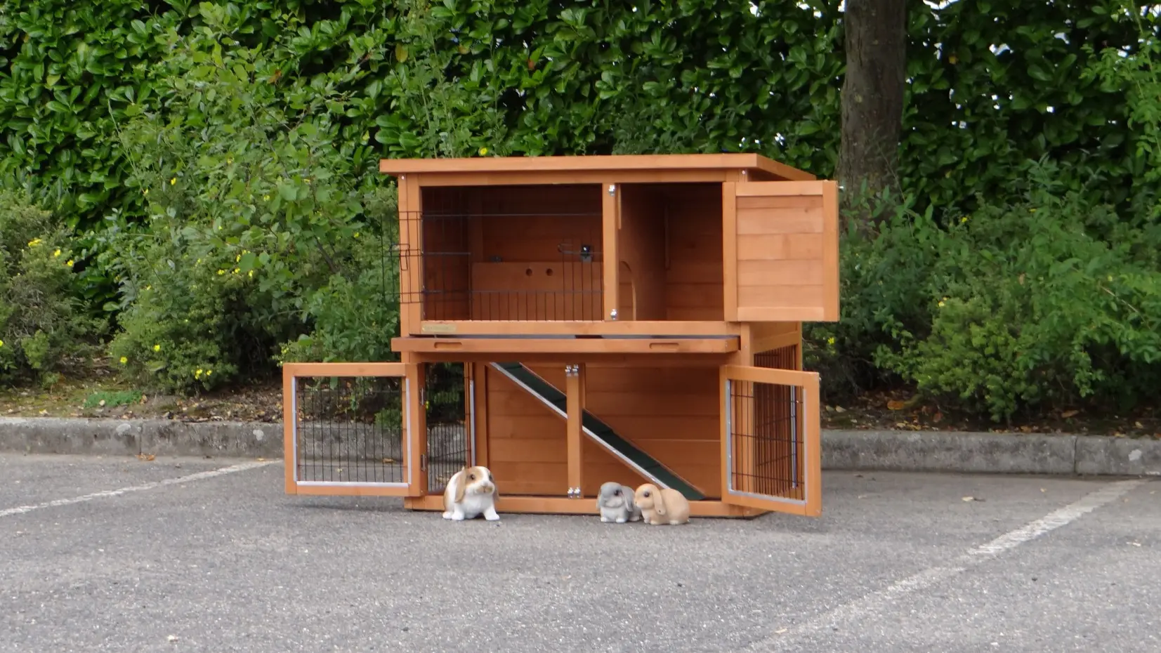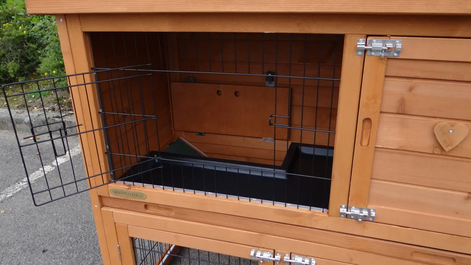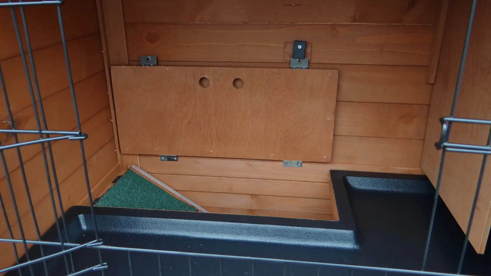 - Die Türen dieses Kaninchenstalls sind mit doppelten Schieberiegeln ausgestattet