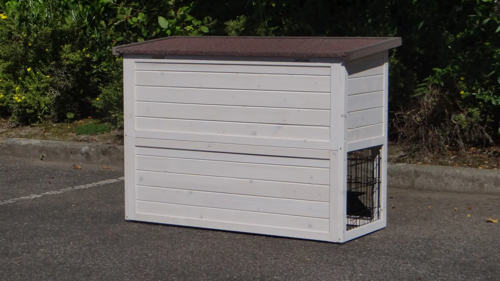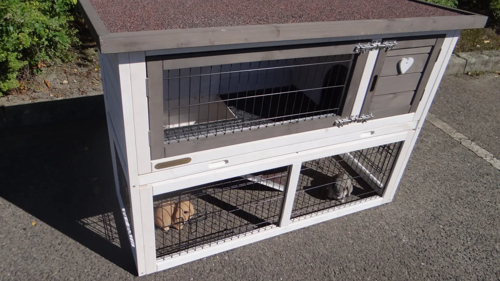 • Das Dach dieses Kaninchenstalls ist mit Dachpappe versehen.