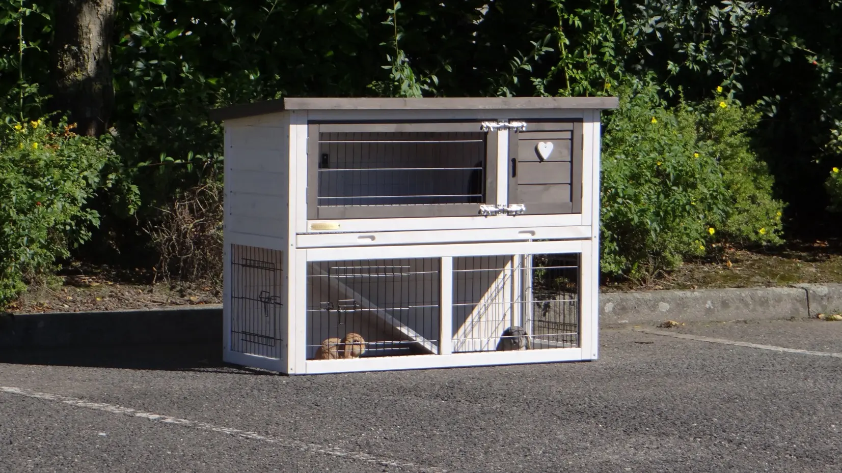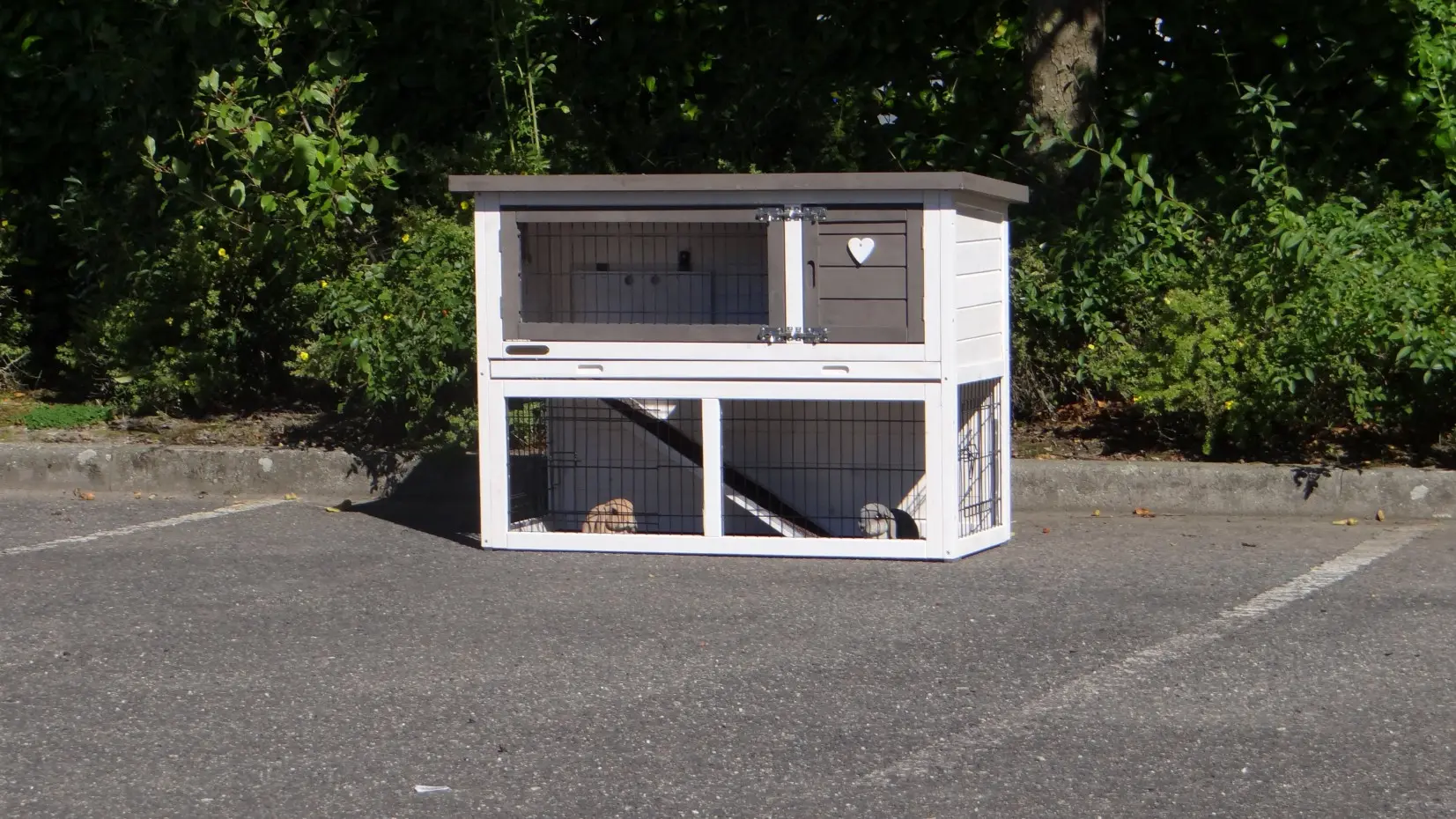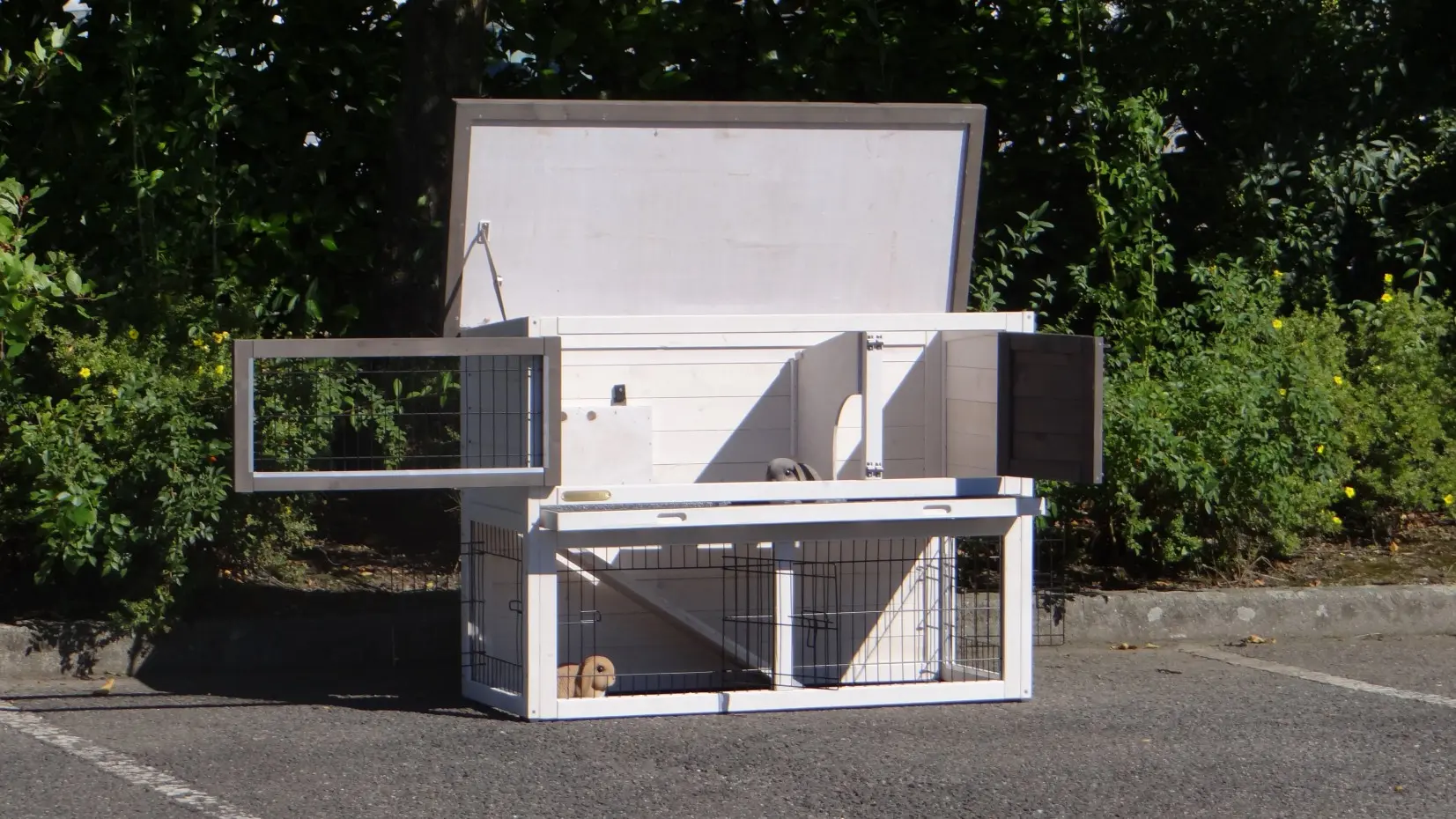 • Die Türen dieses Kaninchenstalls sind mit doppelten Schieberiegeln ausgestattet