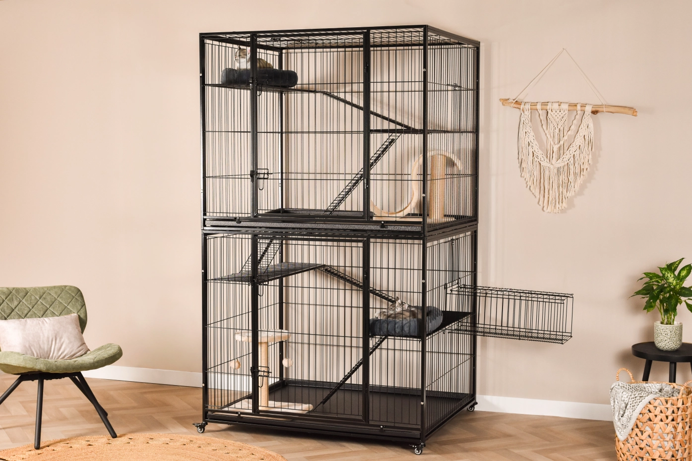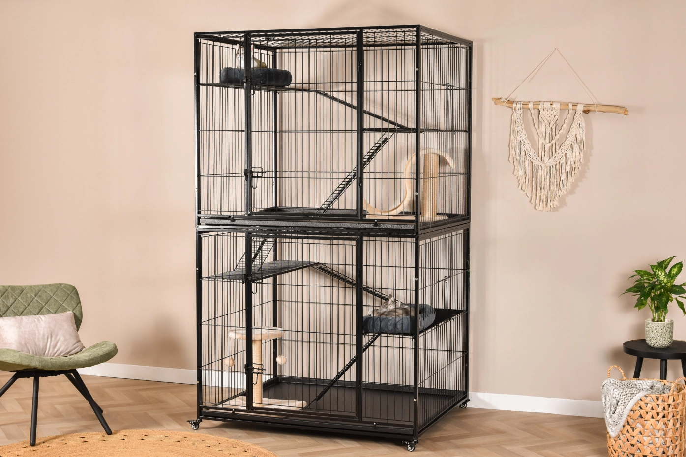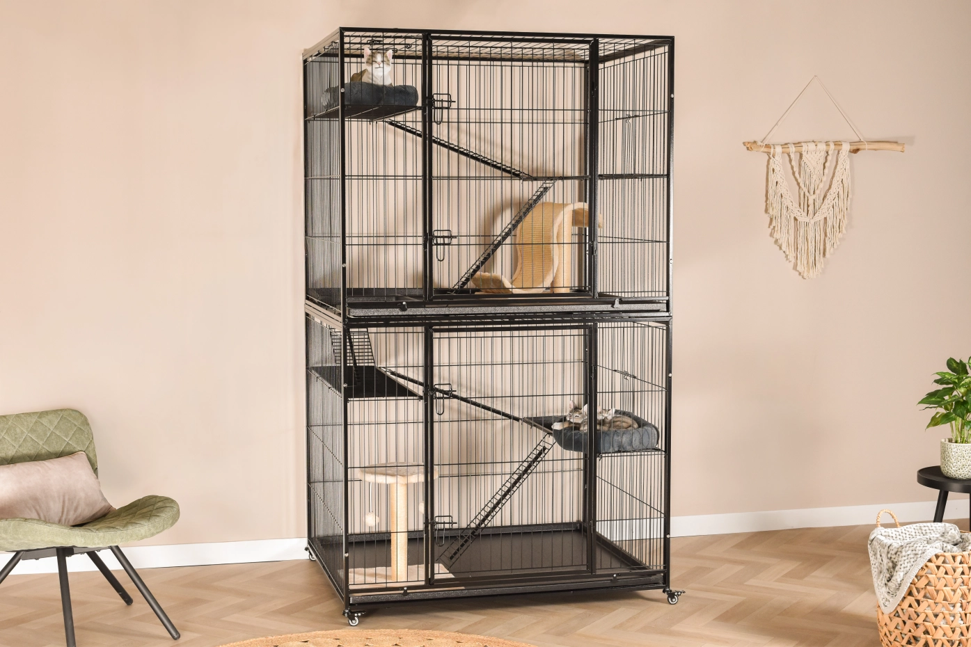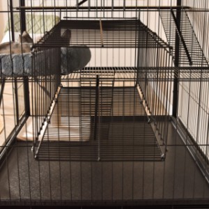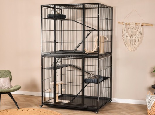 Katzenkäfig Nivo ist ein großer Katzenkäfig für den Innenbereich, geeignet für den Einsatz im Haus oder unter der Veranda. Der Katzenkäfig hat 2 Etagen, die durch Plattformen und Gänge miteinander verbunden sind. Die Öffnung zwischen den beiden Etagen ist abschließbar. Dadurch können beide Etagen unabhängig voneinander genutzt werden.