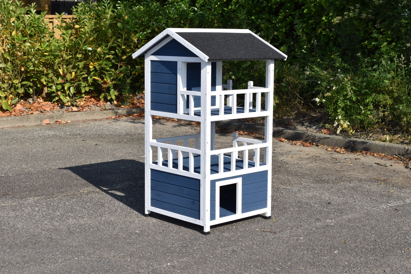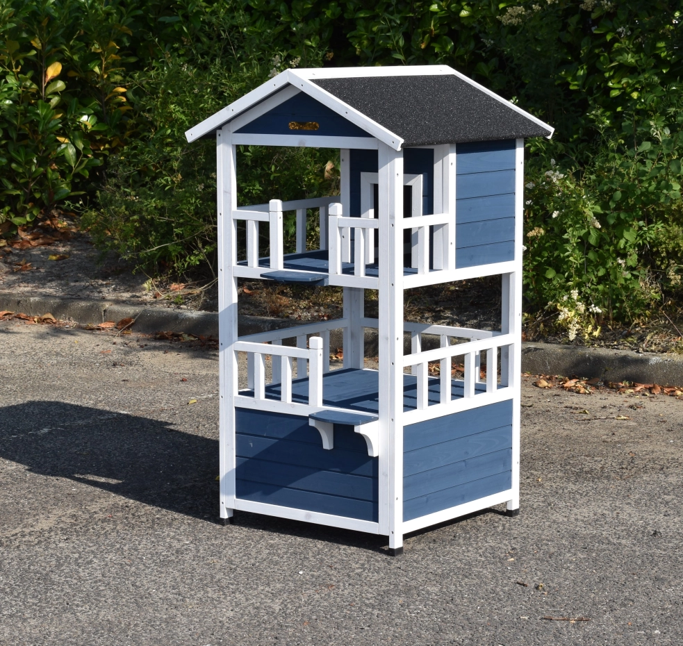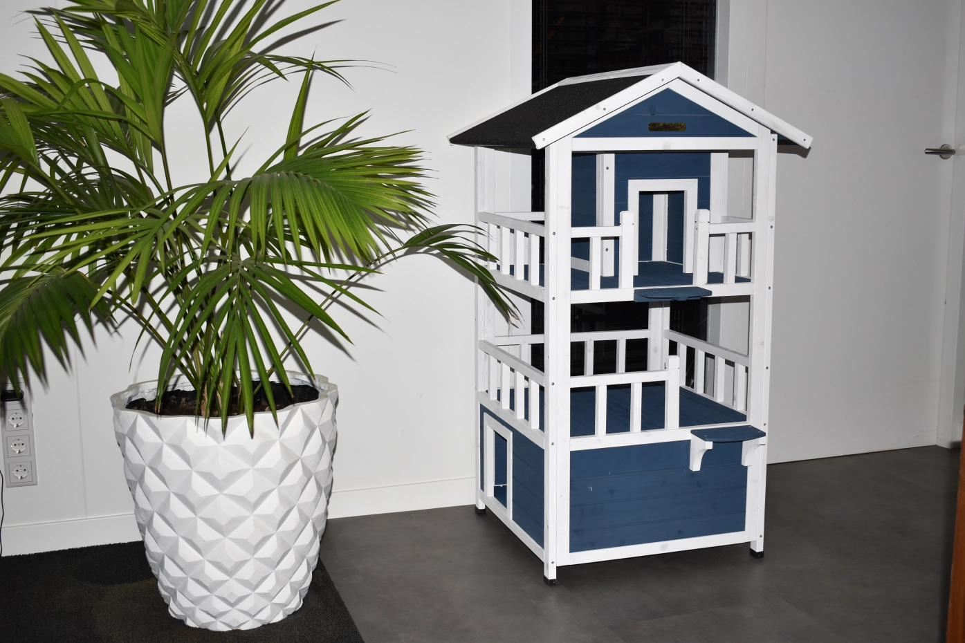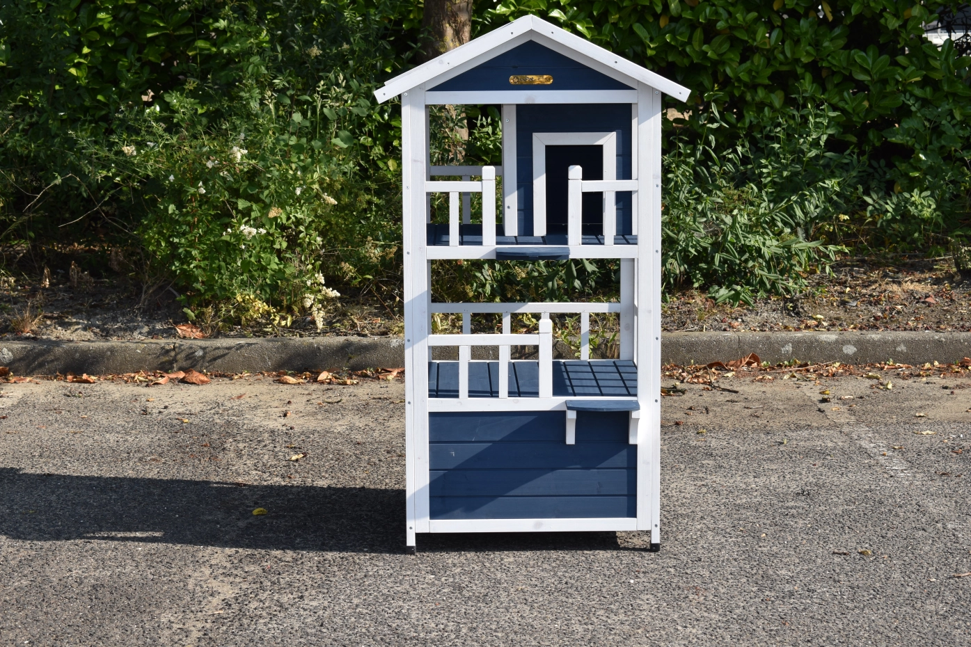 Der Katzenhaus Kitty hat 3 Etagen, um Ihre Kätze mehr Spielraum zu bieten. Kann sowohl Innen als auch draußen verwendet werden. Der Stall hat schöne Farben, nämlich weiß und blau. Die Etagen sind mit weißen Geländern versehen, die dem Haus ein luxuriöses Aussehen verleihen!