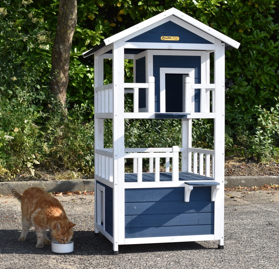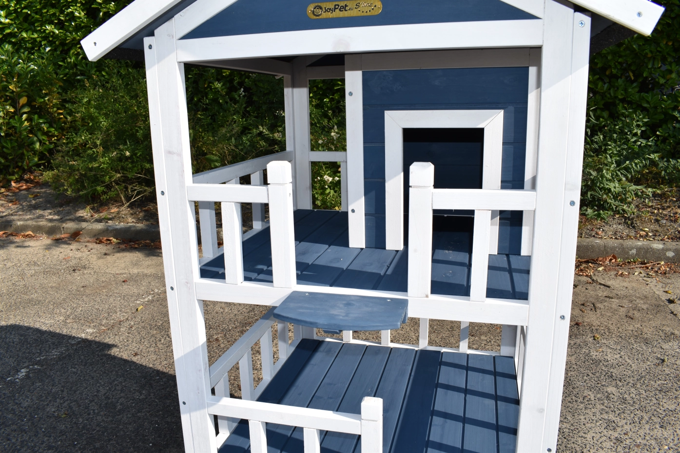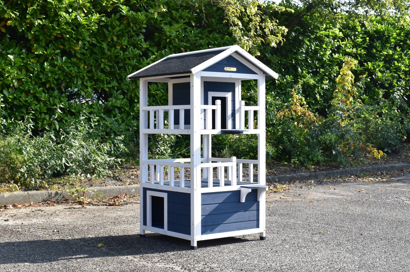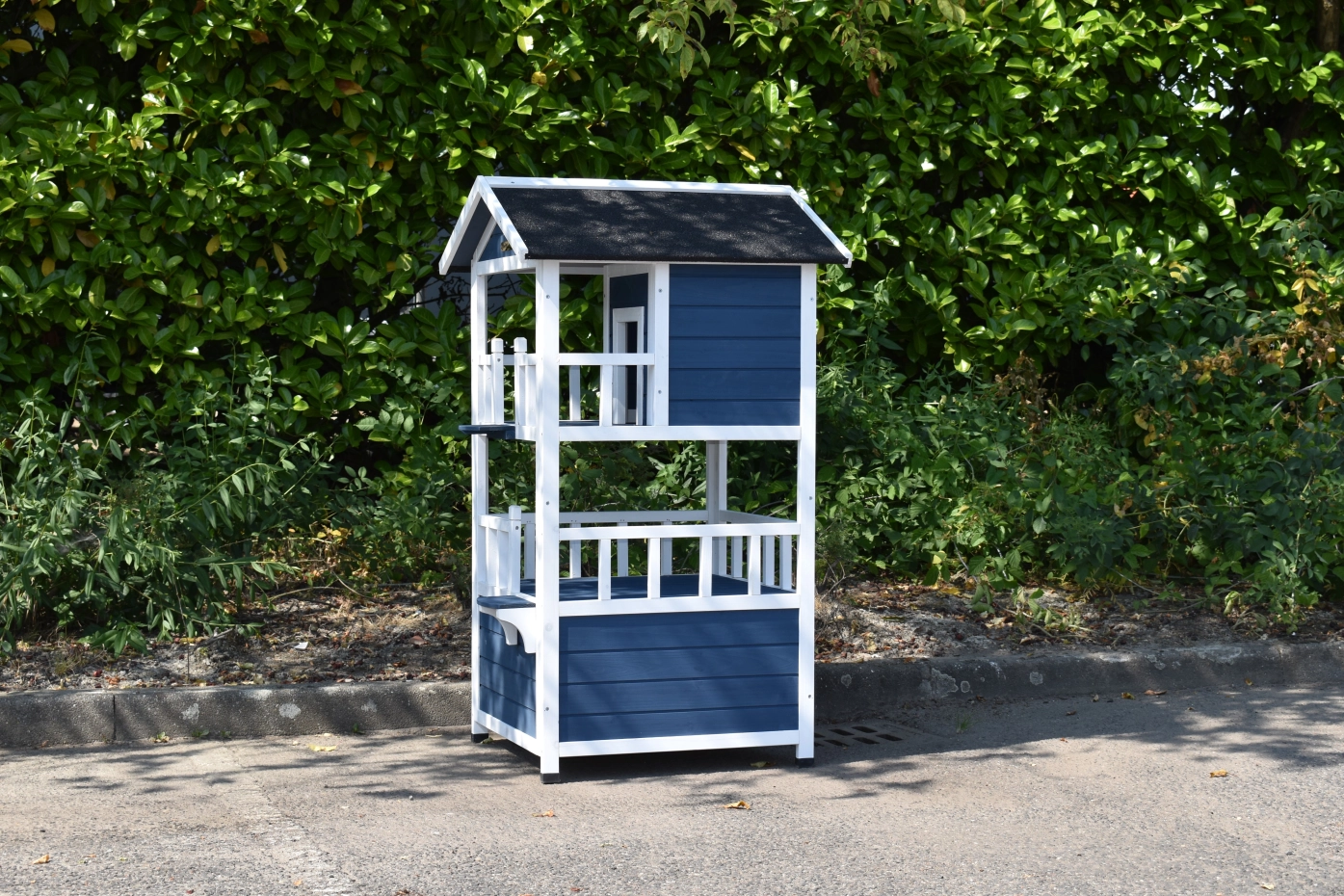 Der Katzenhaus Kitty hat 3 Etagen, um Ihre Kätze mehr Spielraum zu bieten. Kann sowohl Innen als auch draußen verwendet werden. Der Stall hat schöne Farben, nämlich weiß und blau. Die Etagen sind mit weißen Geländern versehen, die dem Haus ein luxuriöses Aussehen verleihen!
