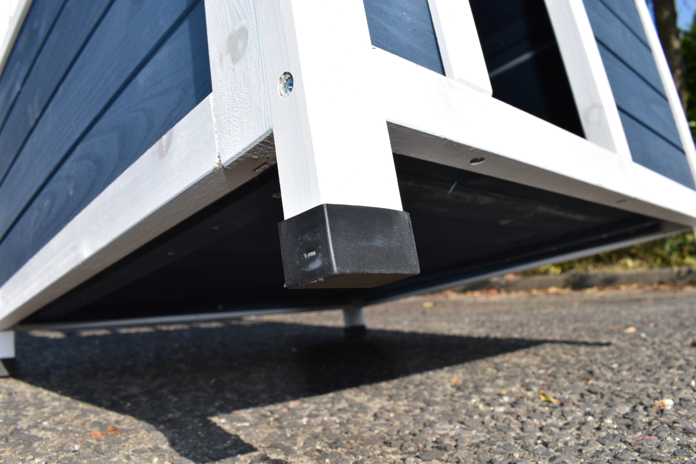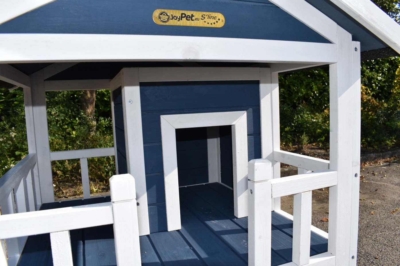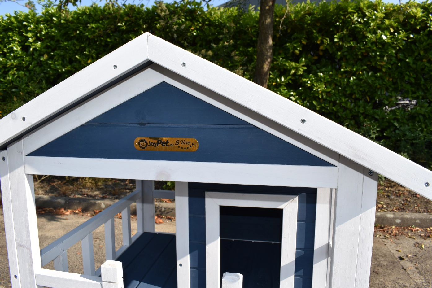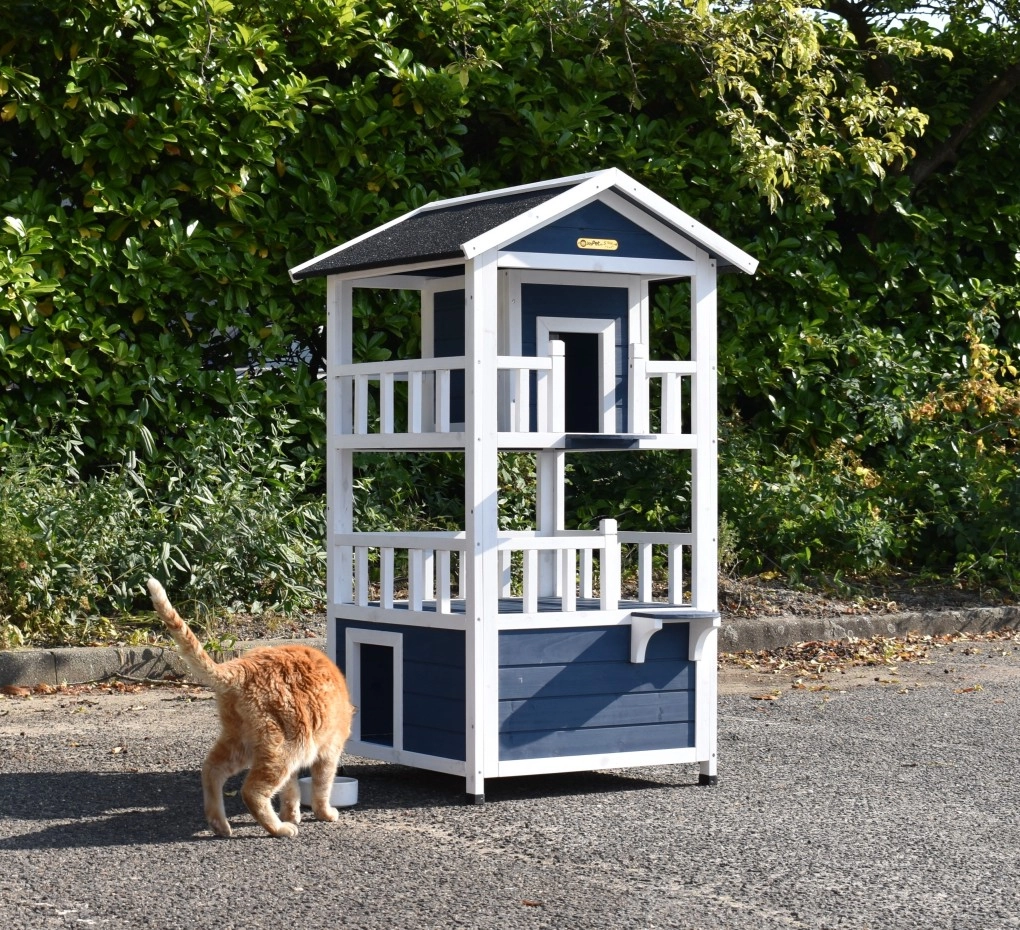 Der Katzenhaus Kitty hat 3 Etagen, um Ihre Kätze mehr Spielraum zu bieten. Kann sowohl Innen als auch draußen verwendet werden. Der Stall hat schöne Farben, nämlich weiß und blau. Die Etagen sind mit weißen Geländern versehen, die dem Haus ein luxuriöses Aussehen verleihen!