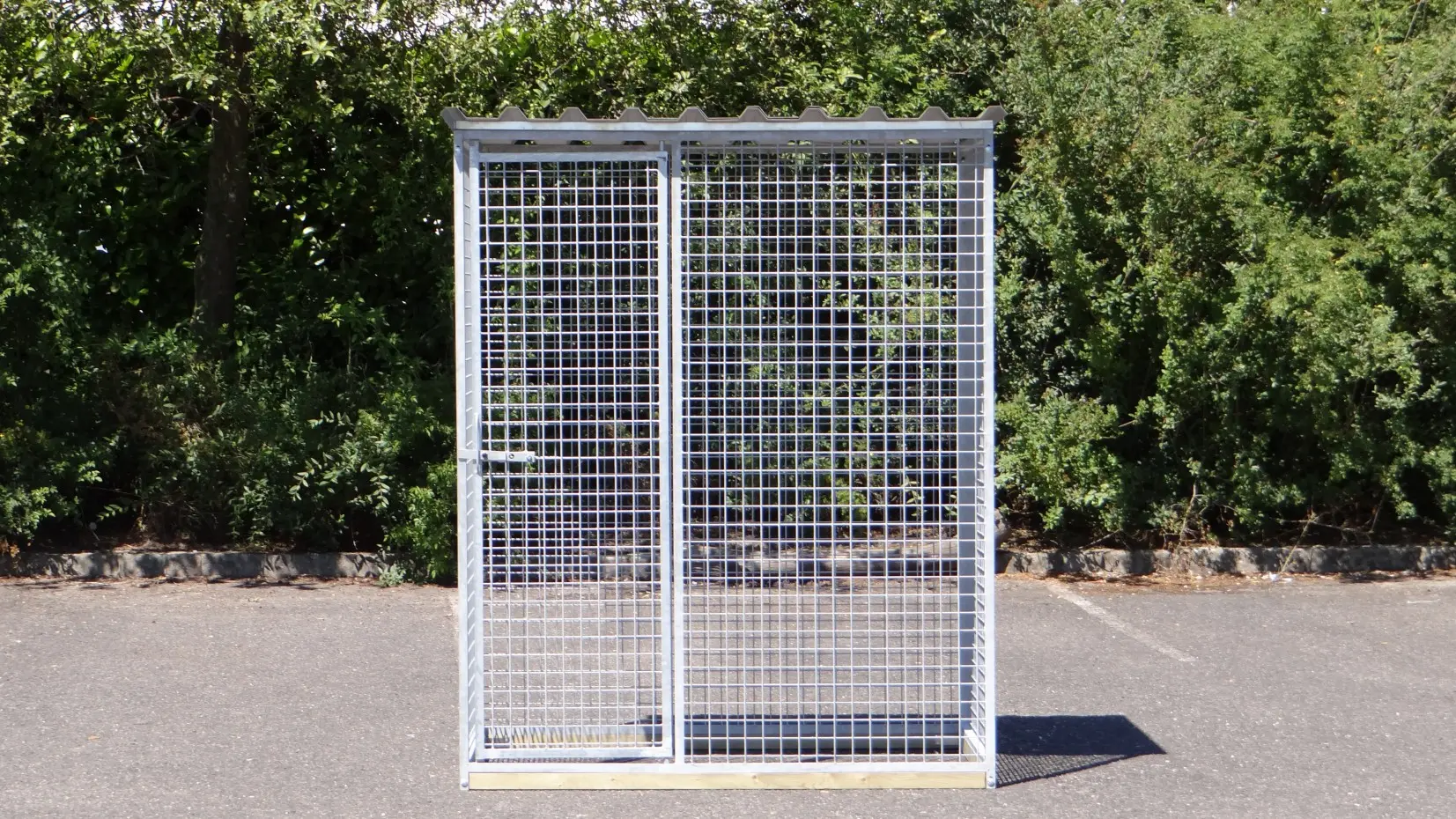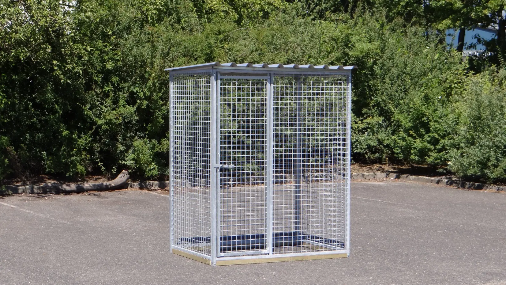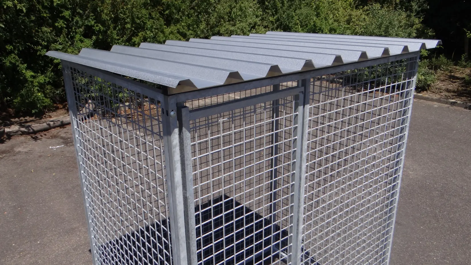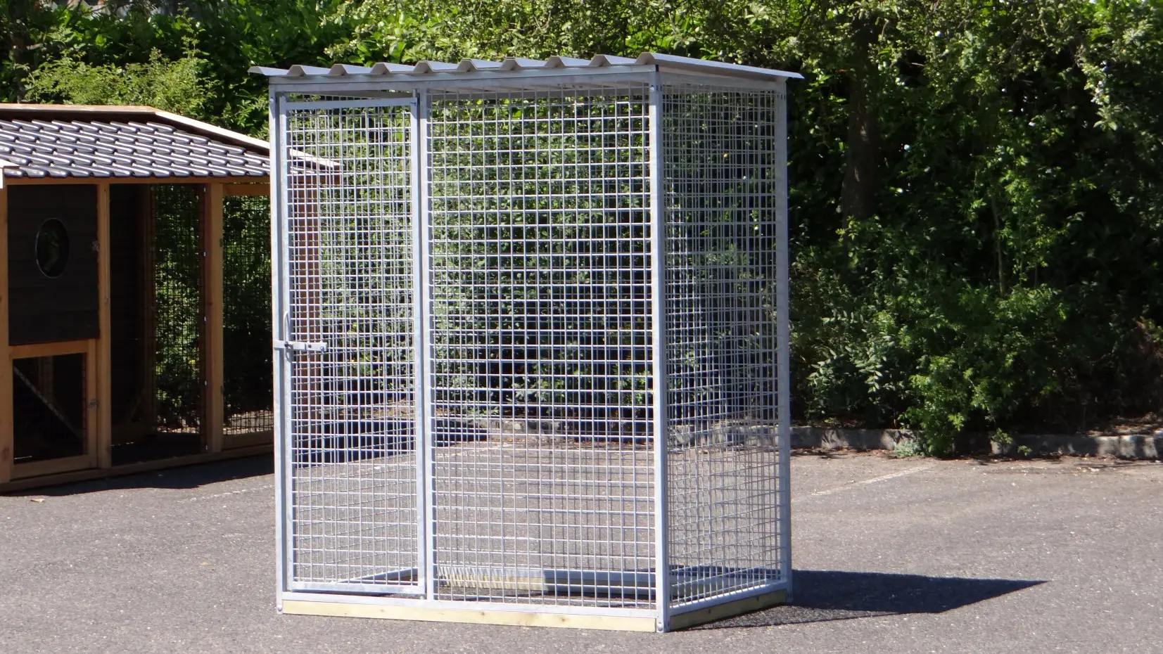 Versehen mit einem geschlossenen Dach, so das die Tiere trocken bleiben bei Regen.