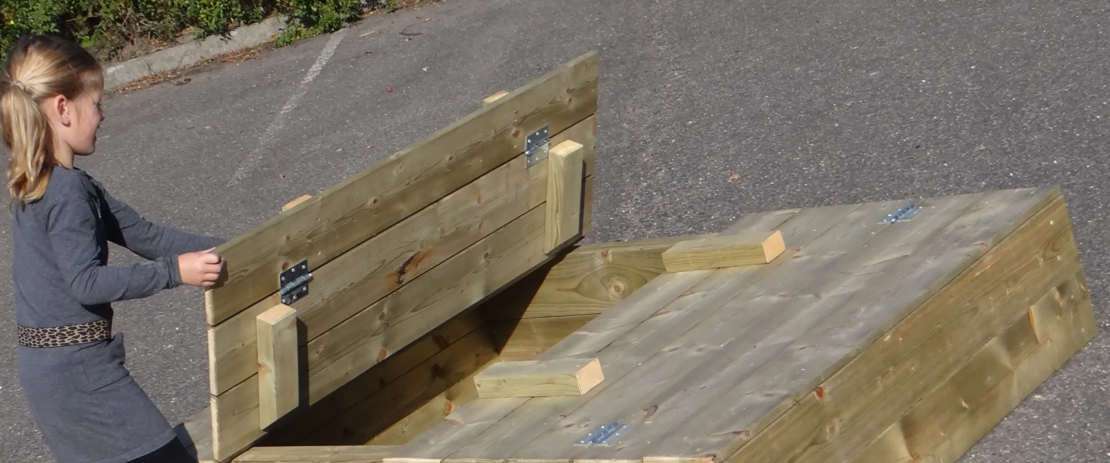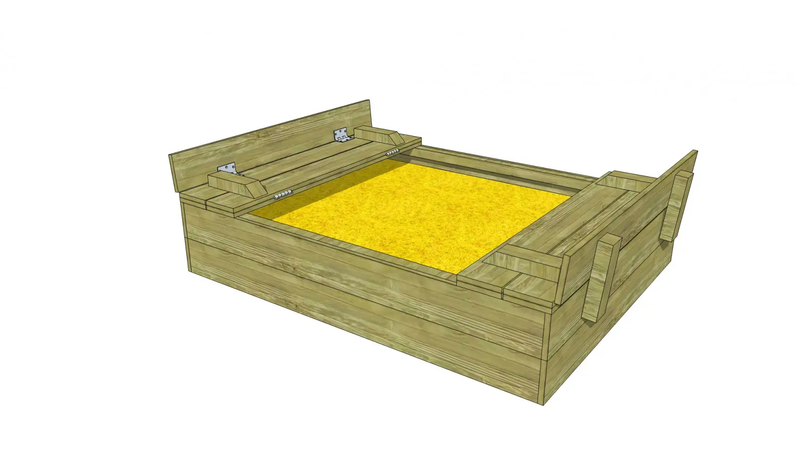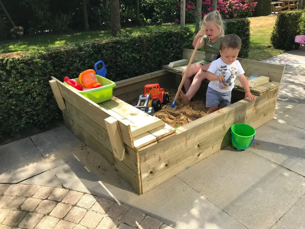 - Der Deckel des Sandkastens kann leicht hochgeklappt werden, so dass 2 Bänke entstehen